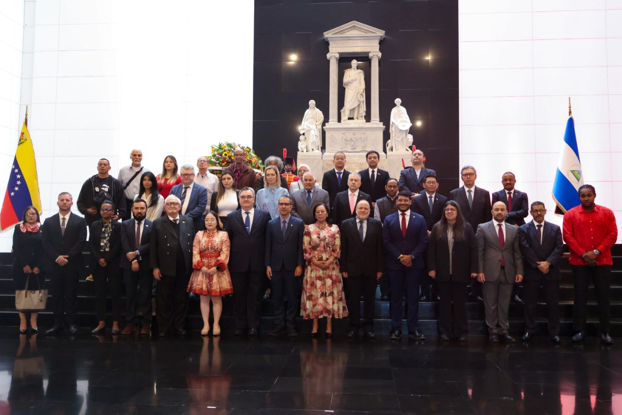 Con una ofrenda floral colocada ante el sarcófago que resguardan los restos mortales del Libertador Simón Bolívar en el Panteón Nacional, el viceministro para América Latina del Ministerio del Poder Popular para Relaciones Exteriores de la República Bolivariana de Venezuela, Rander Peña -en nombre del canciller Yván Gil-, acompañó este viernes a la embajadora de la República de Nicaragua, Daysi Ivette Torres, en la conmemoración en Caracas del 91° aniversario del Tránsito a la Inmortalidad del General de Hombres Libres, Augusto César Sandino.