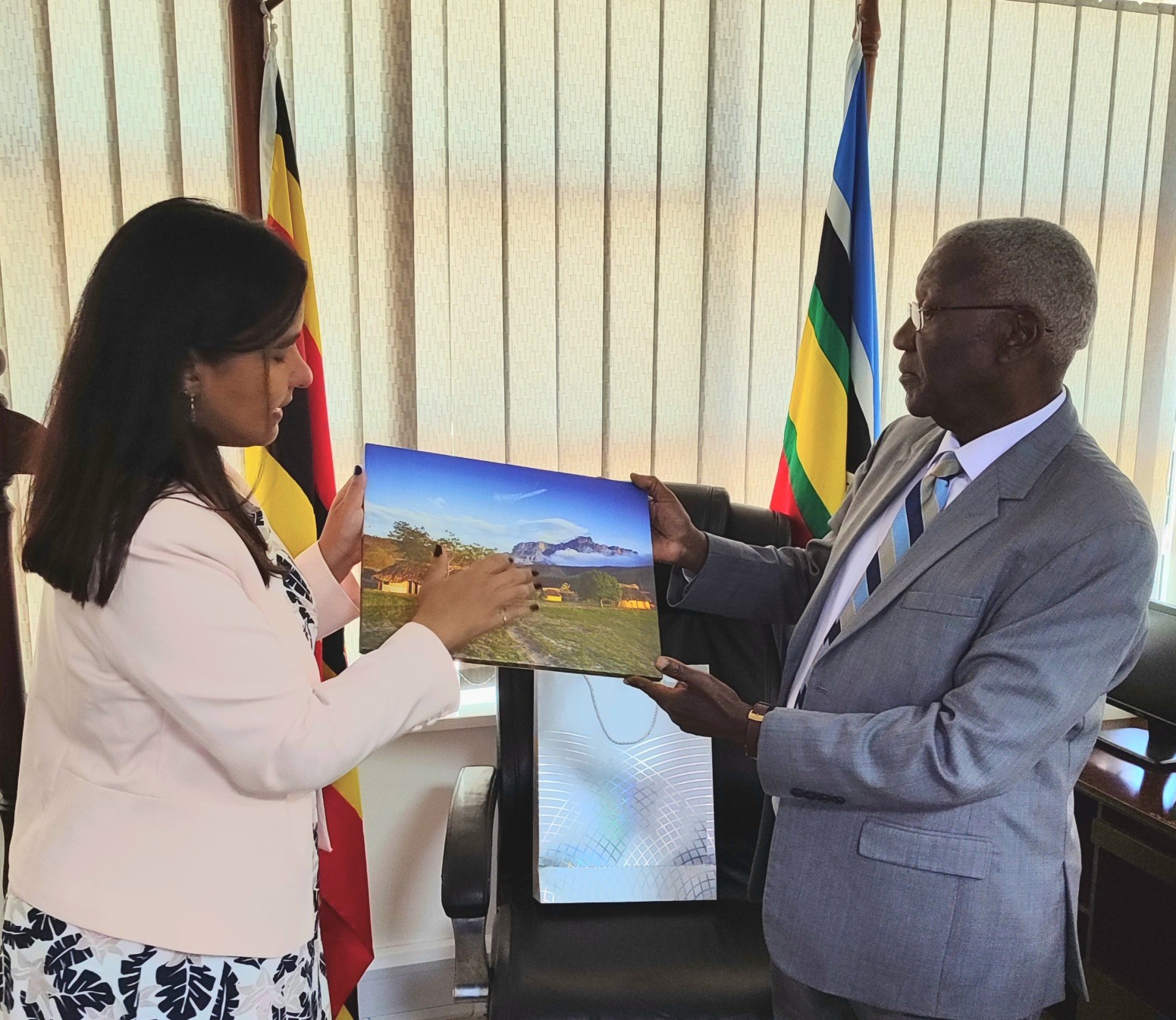Durante el encuentro, celebrado en la sede del Ministerio de Turismo en Kampala, la Embajadora destacó el potencial turístico de Venezuela y expresó el interés de su país en promover el intercambio de experiencias y conocimientos en el sector. Asimismo, subrayó la importancia del turismo sostenible como motor de desarrollo económico y social.