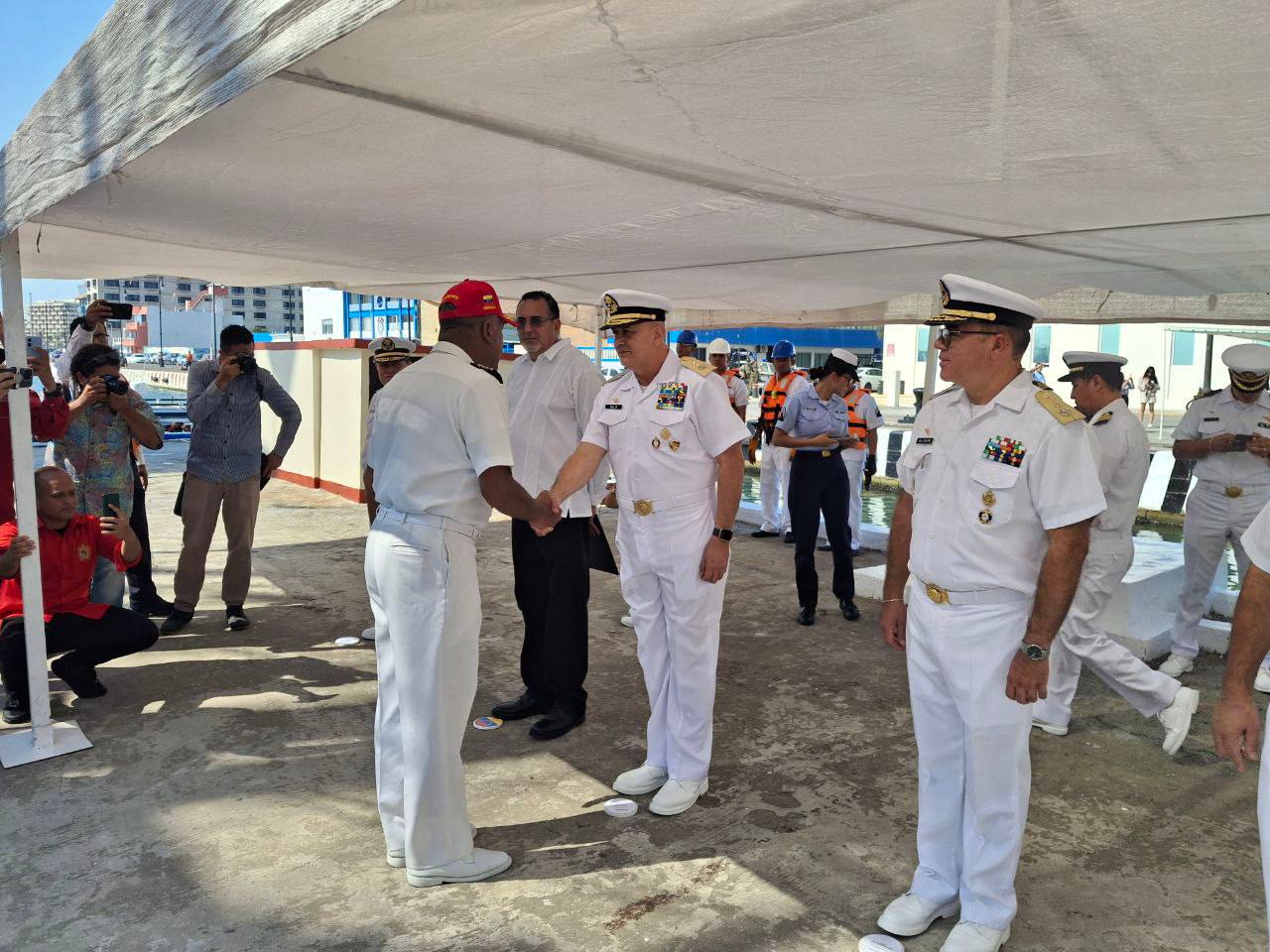 Autoridades de la Embajada de la República Bolivariana de Venezuela junto a la Marina Mexicana dieron la bienvenida a la nave insignia, que arriba a costas mexicanas, tras dos meses de navegación por las aguas del Caribe.