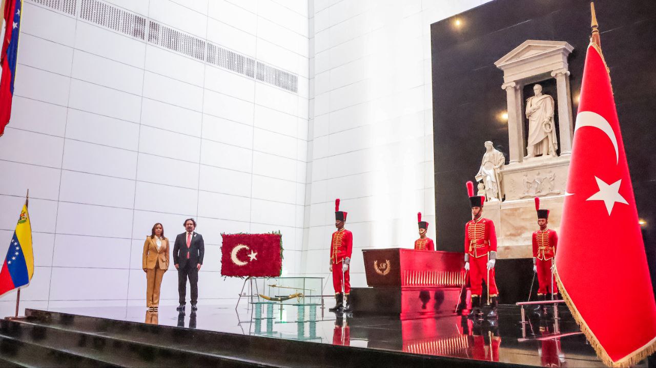 La viceministra para Europa y América del Norte del Ministerio del Poder Popular para Relaciones Exteriores de la República Bolivariana de Venezuela, Andrea Corao, acompañó este miércoles al embajador de la República de Türkiye, Naci Aydan Karamanoğlu, en la ceremonia de ofrenda floral al Libertador Simón Bolívar en el Panteón Nacional, en Caracas, con motivo del 102 aniversario de la fundación del país euroasiático.