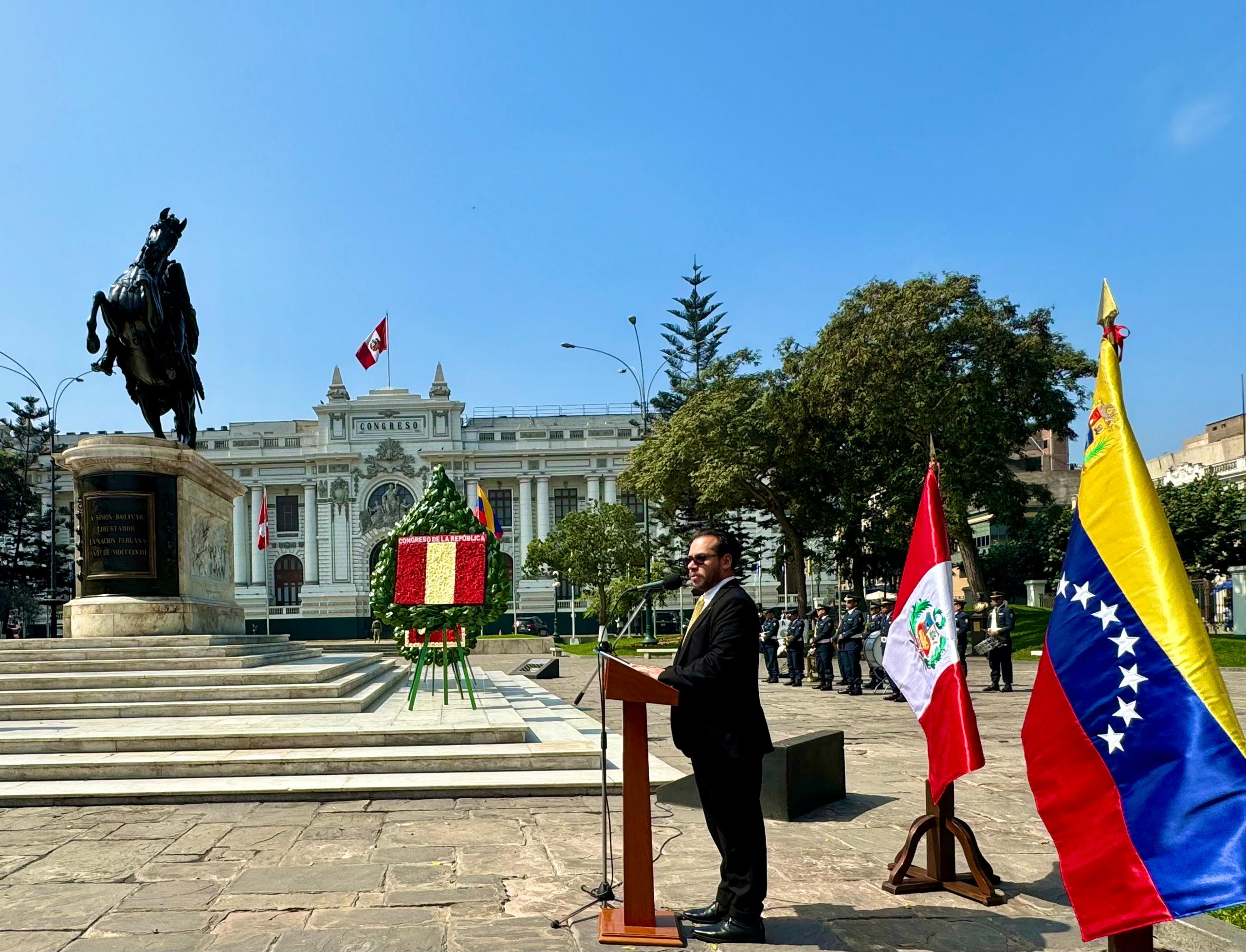 En esta emotiva actividad, estuvieron presentes autoridades y miembros del Cuerpo Diplomático acreditado en el Perú, congresistas de la República, la Liga Parlamentaria de Amistad Peruano Venezolana, líderes de partidos políticos, movimientos y organizaciones sociales del país, quienes rindieron ofrendas florales en reverencia a esta fecha patria en la hermana nación bolivariana.