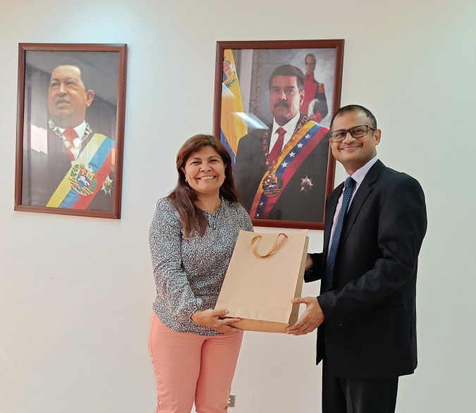 La viceministra para Asia, Medio Oriente y Oceanía del Ministerio del Poder Popular para Relaciones Exteriores, Tatiana Pugh Moreno, acompañó a la viceministra para Nuevas Fuentes y Uso Racional de la Energía Eléctrica del Ministerio del Poder Popular para la Energía Eléctrica, Tania Masea Linares, en un grato encuentro con el embajador de la República de la India acreditado en Venezuela, P K Ashok Babu.