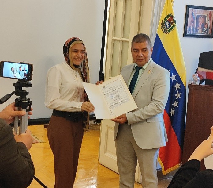 El acto, celebrado en la sede de la Misión Diplomática venezolana en El Cairo, contó con una concurrida asistencia de representantes de los grupos de solidaridad con Venezuela y de profesionales de medios de comunicación.