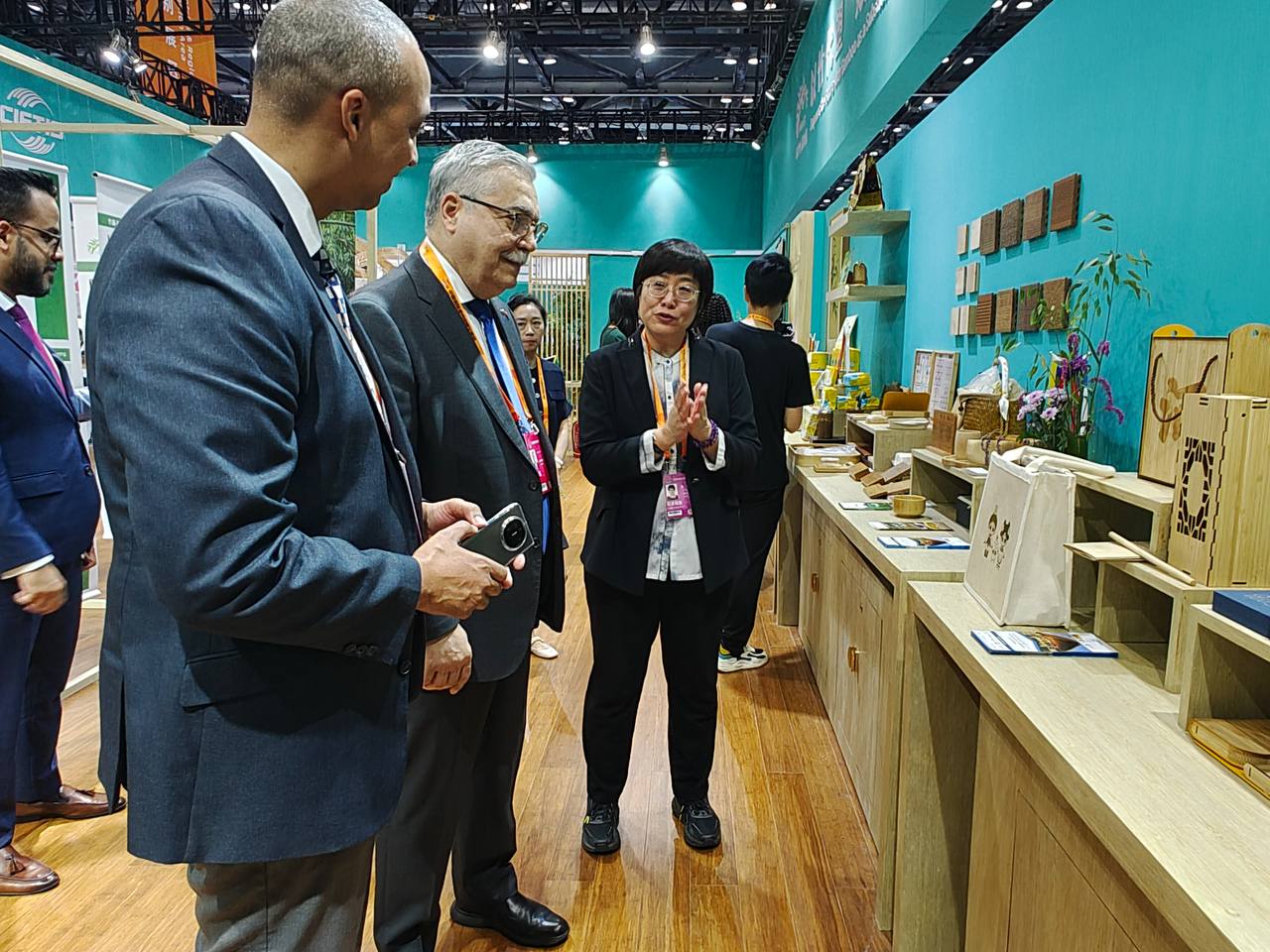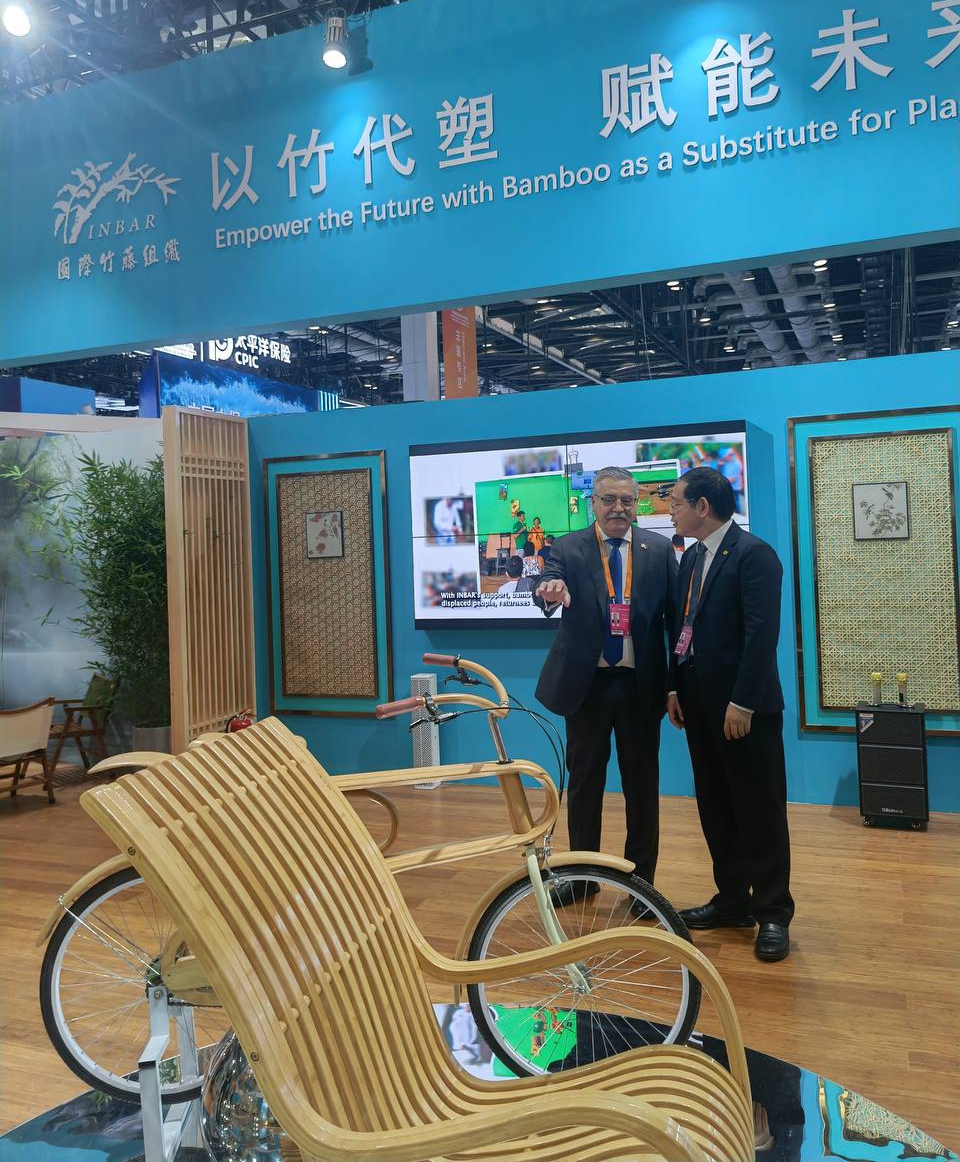 Seguidamente, el embajador venezolano Giuseppe Yoffreda Yorio, acompañado de Lu Wenming, director general adjunto de INBAR, y el grupo de embajadores del GRULAC, recorrió la exhibición. En un espacio de 200 metros cuadrados, el Jefe de Misión apreció una amplia variedad de productos hechos con bambú, destacando mesas y sillas de picnic, cajas de pañuelos, cajas de té, balones de fútbol, tazas térmicas, gama de bolsos, cubiertos, loncheras, bandejas, porcelana tejida de bambú, bicicletas, objetos decorativos, juego de mesa de té, cuadernos, suministros para acampar y de oficina, entre muchos otros productos de uso diario.