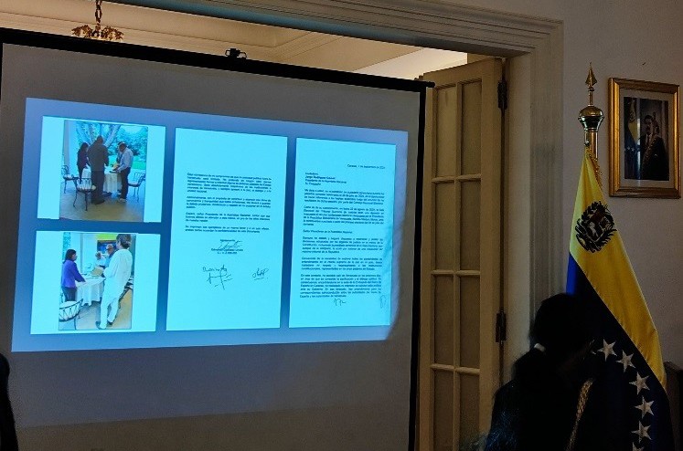 En este orden de ideas, el Embajador presentó las fotos del momento en que González Urrutia firmó y entregó a la vicepresidenta ejecutiva, Delcy Rodríguez, la carta en cuestión, hecho que tuvo lugar en la sede de la Embajada de España en Caracas, y se recalcó que las conversaciones entre las partes se desarrollaron en un clima cordial, sin presiones ni coacción de ningún tipo.