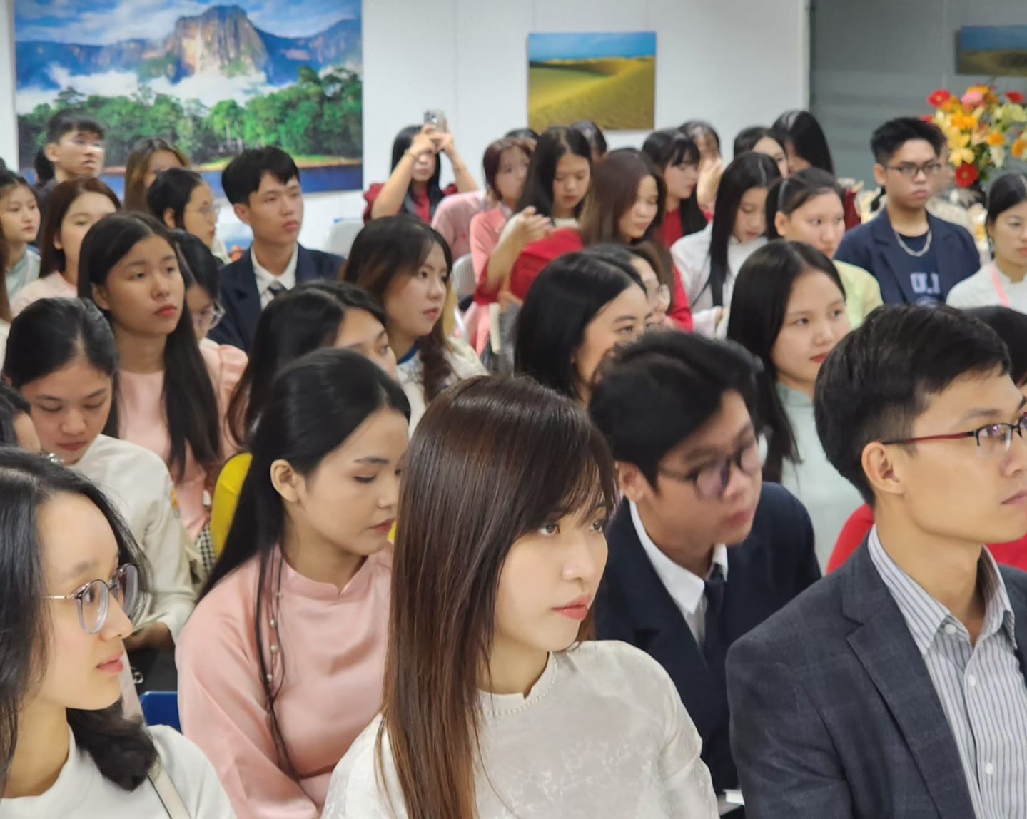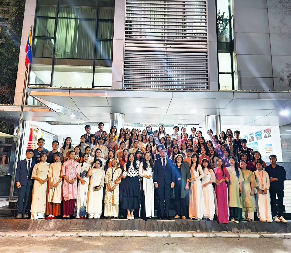 La Misión Diplomática de la República Bolivariana de Venezuela en Hanói recibió este viernes la visita de más de 70 jóvenes estudiantes de la Escuela de Relaciones Internacionales de la Universidad de Hué, quienes, acompañados por académicos y profesores, fueron cordialmente recibidos por el embajador Juan Carlos Fernandes Juárez, el personal diplomático y local.