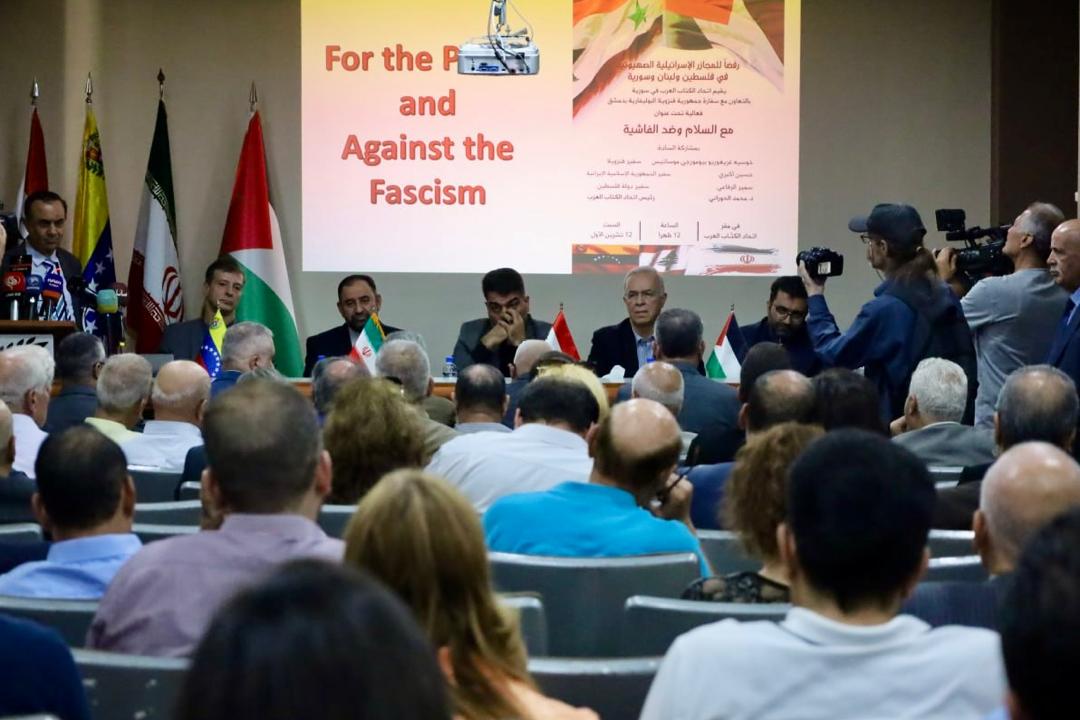 En el evento, organizado por la Unión de Escritores Árabes en cooperación con la Embajada de la República Bolivariana de Venezuela en Damasco, el diplomático venezolano estuvo acompañado por sus homólogos de la República Islámica de Irán, Husein Akbari, y del Estado de Palestina, Samir Al-Rifai, de Palestina, además de Muhammad Horani, presidente de la Unión de Escritores Árabes.