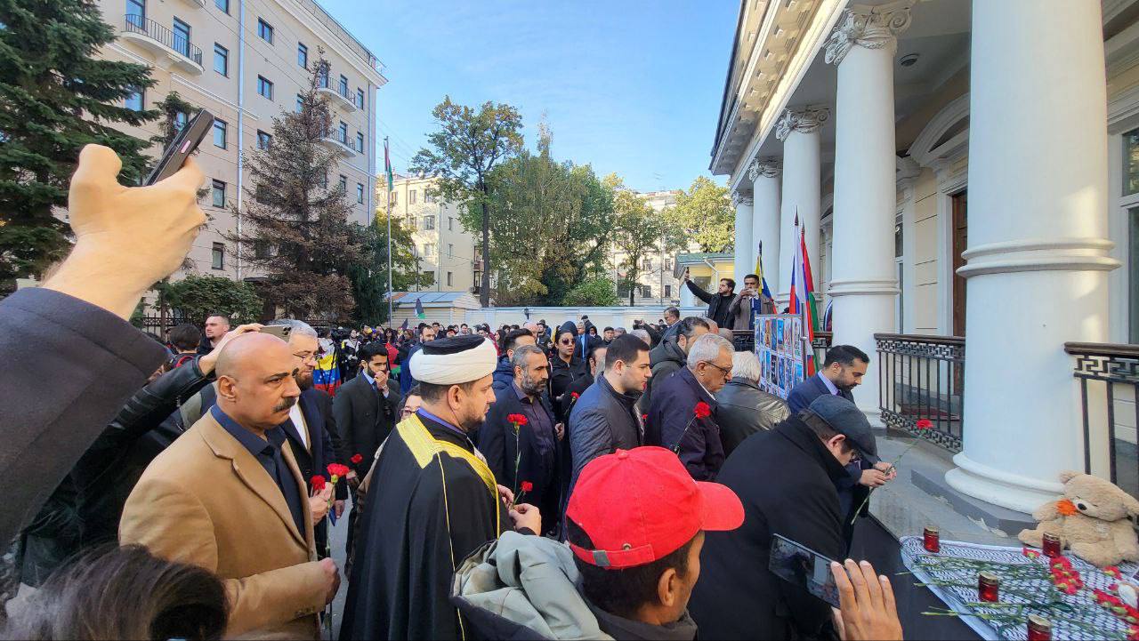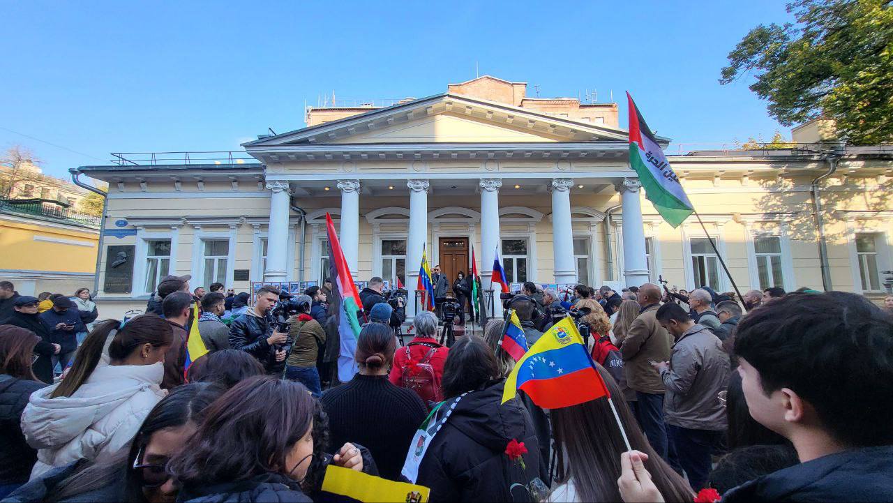 Este sábado, 12 de octubre, frente a la Embajada del Estado de Palestina en Moscú, se desarrolló una concentración en apoyo a los pueblos de Palestina y Líbano, organizada por el Capítulo Rusia de la Internacional Antifascista y el Movimiento de Solidaridad con Venezuela.