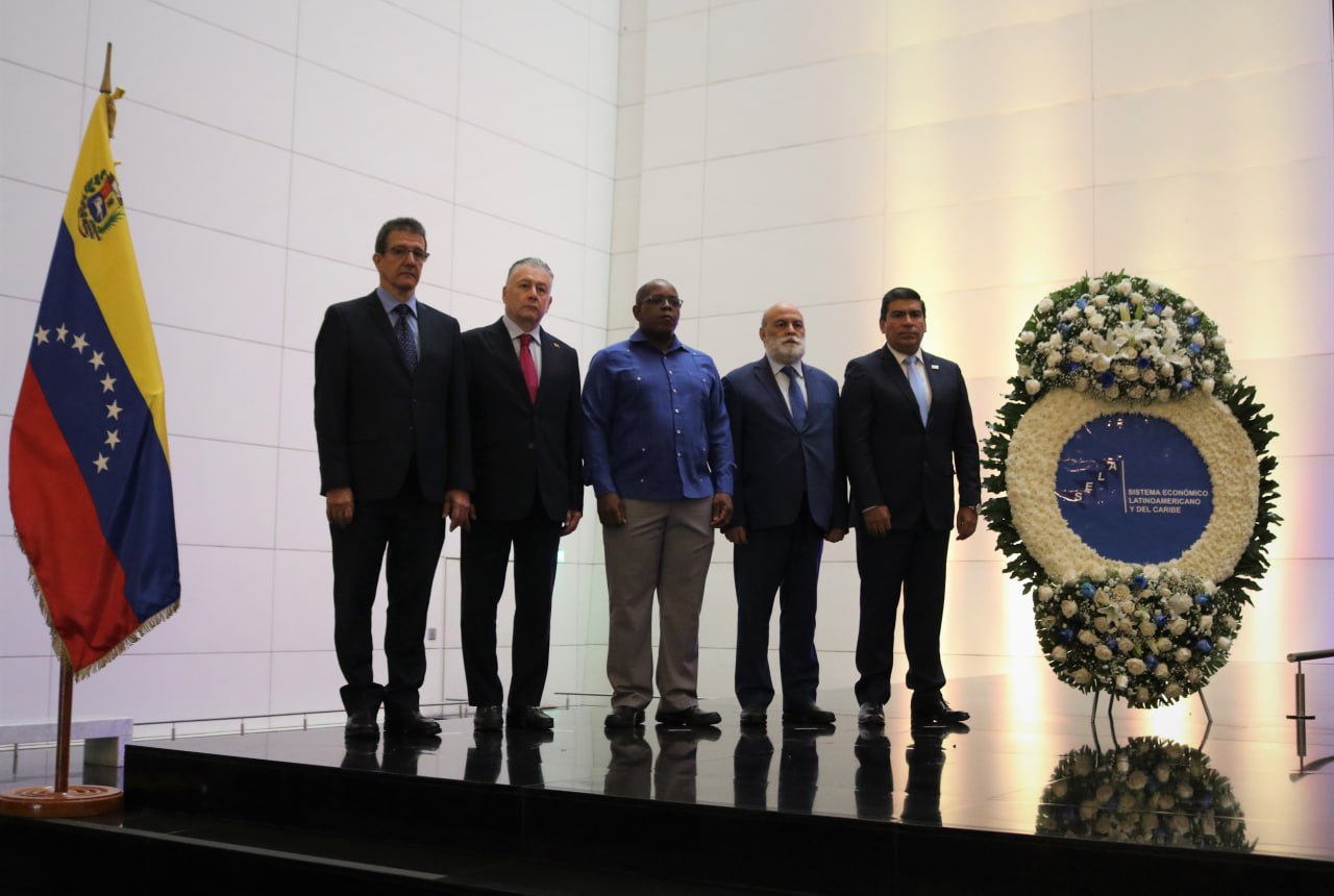 Con motivo de la conmemoración del 49° aniversario de la Firma del Convenio de Panamá, la Secretaría Permanente del Sistema Económico Latinoamericano y del Caribe (SELA) realizó este lunes una ofrenda floral en el Mausoleo donde reposan los restos mortales del Libertador Simón Bolívar, en el Panteón Nacional, en Caracas.