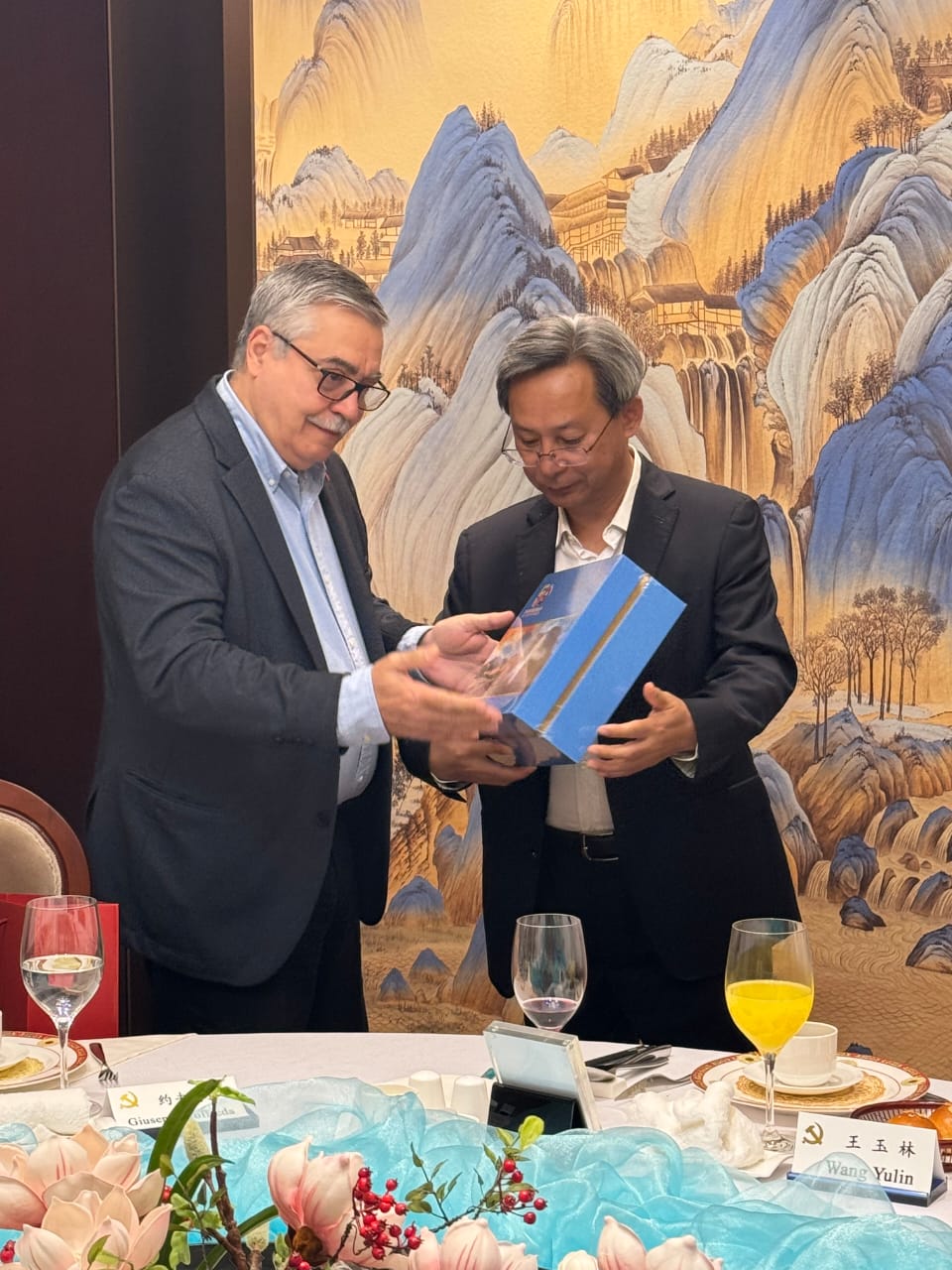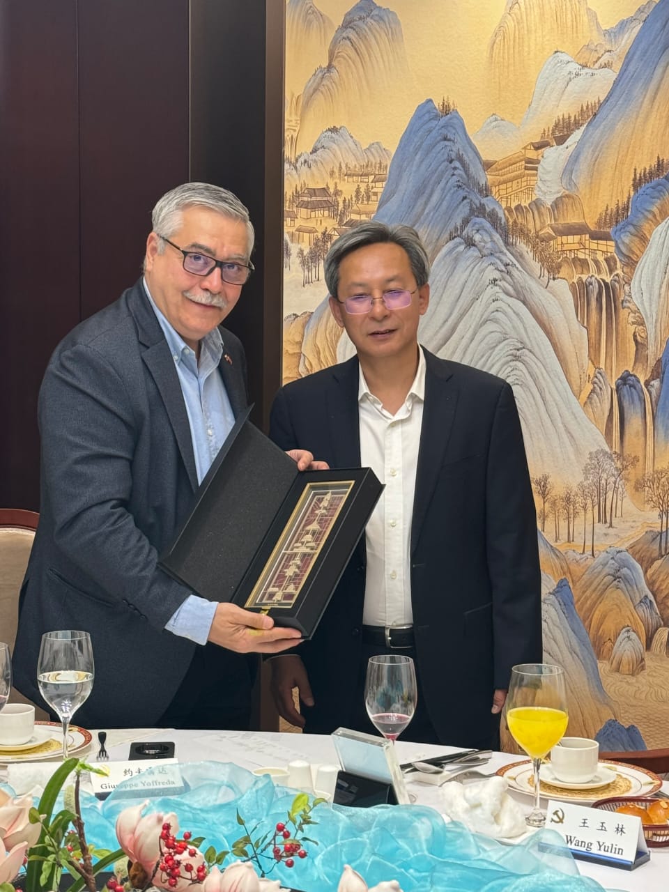 Con una emotiva cena, el embajador Wang Yulin, director general del Buró para América Latina y el Caribe del Departamento Internacional del Comité Central del Partido Comunista de China (PCCh), homenajeó en nombre del ministro del Departamento Internacional del CCPCCh, Liu Jianchao, y del viceministro Ma Hui, del mismo departamento, al embajador de la República Bolivariana de Venezuela en la República Popular China, Giuseppe Yoffreda Yorio, quien acaba de finalizar su misión en este país tras dos años y medio de intenso trabajo, transmitiéndole un mensaje de entusiasmo y admiración por haber sido un digno representante de su país.