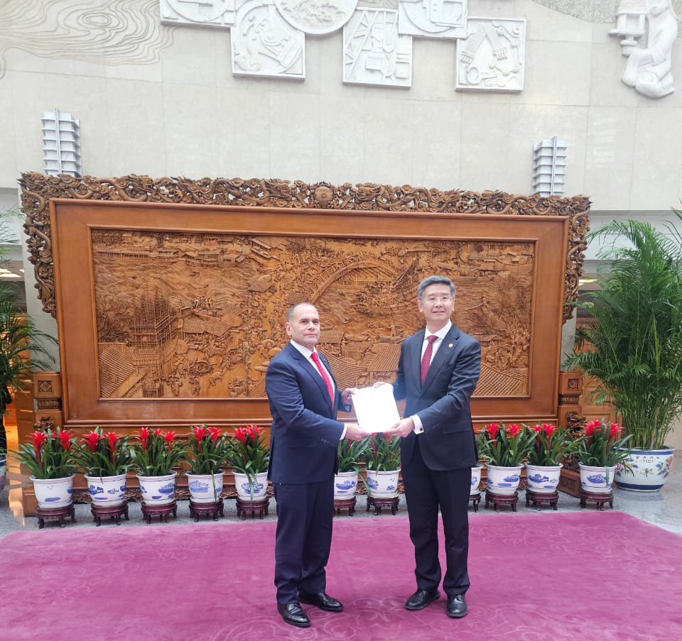 El embajador de la República Bolivariana de Venezuela, Remigio Ceballos Ichaso, presentó este jueves las Copias de Estilo de las Cartas Credenciales ante el subdirector general del Departamento de Protocolo de la Cancillería de la República Popular China, Li Jinjin.