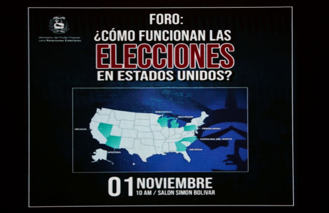 Desde los espacios del Salón "Simón Bolívar", en la torre administrativa del Ministerio del Poder Popular para Relaciones Exteriores, en Caracas, se realizó este viernes el Foro Abierto "¿Cómo funcionan las Elecciones en EEUU?", de cara a los comicios del próximo 5 de noviembre en la nación norteamericana.
