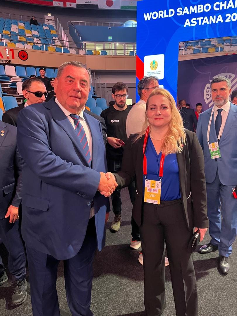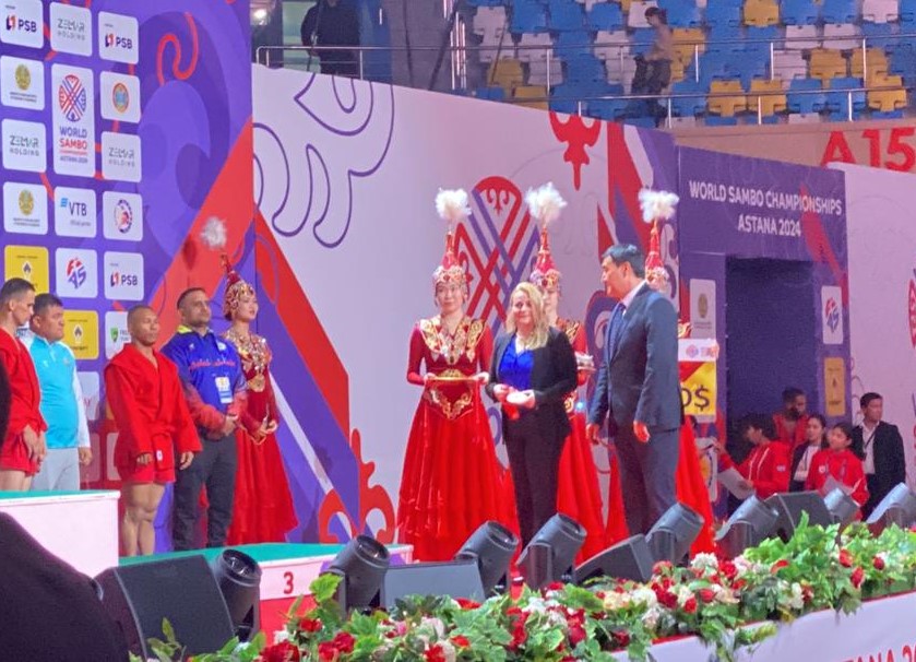 Asimismo, Aidos Akzhanov, presidente de la Federación de Kazajistán de Deportes y Sambo de Combate, intercambió palabras con la Jefa de Misión venezolana, expresando el interés mutuo en impulsar la cooperación bilateral en materia de sambo y otras disciplinas de lucha.