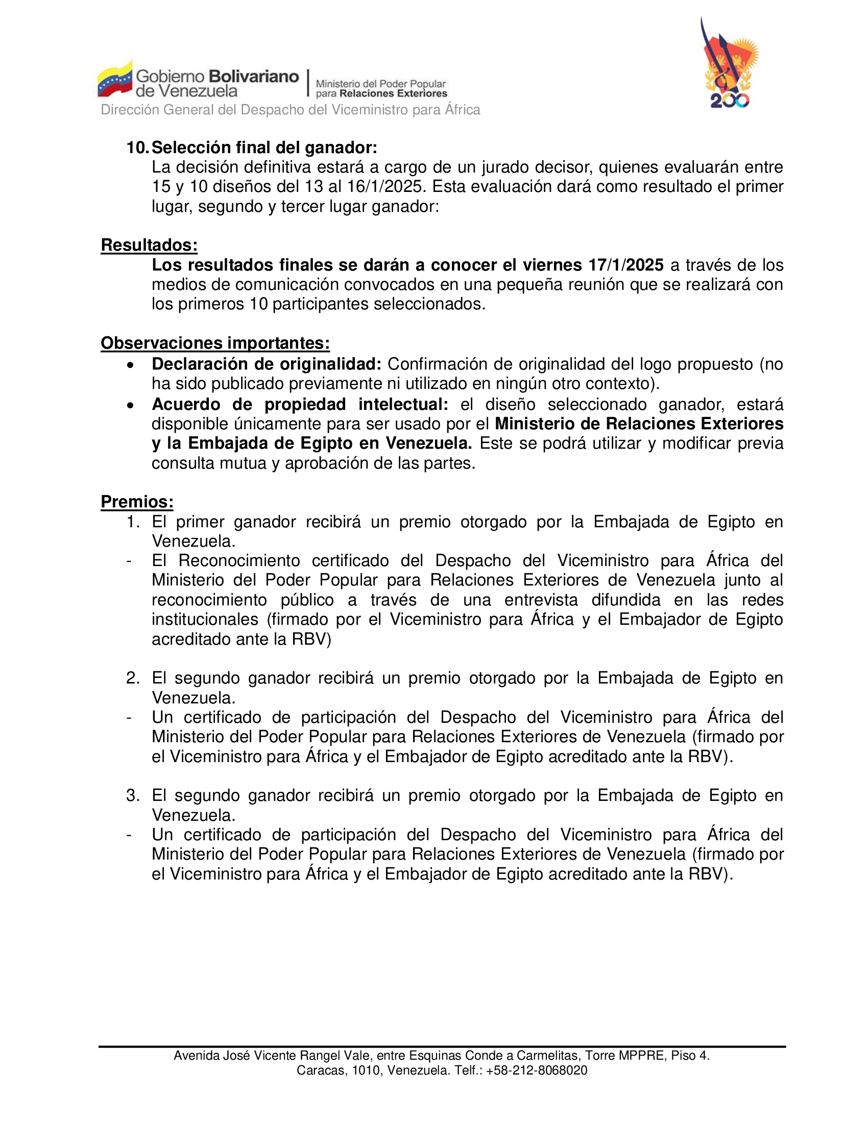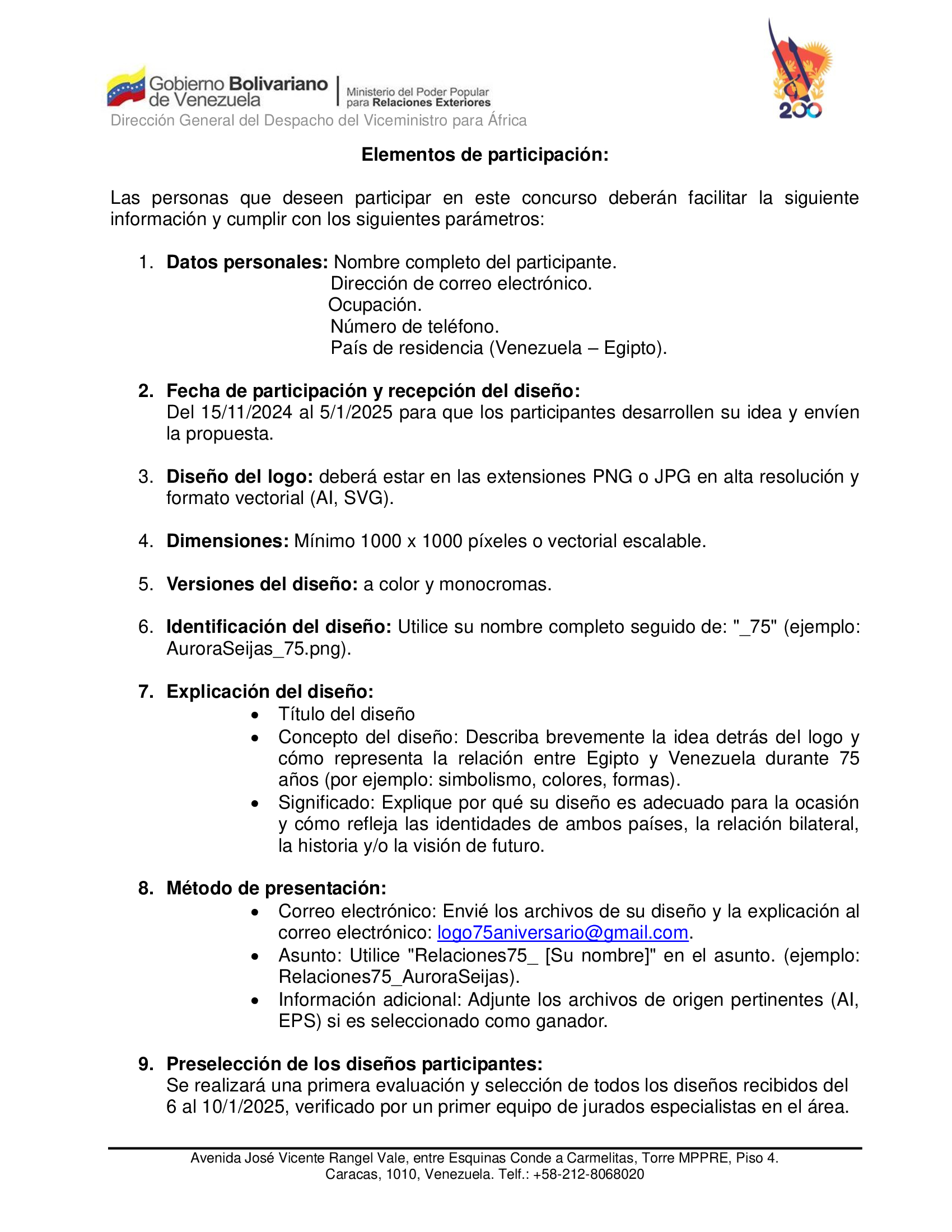 Las y los diseñadores que deseen participar deben desarrollar al máximo su creatividad para construir un logo que, además de representar la relación bilateral entre Venezuela y Egipto durante 75 años, refleje las identidades de las partes, historia y/o visión de futuro.