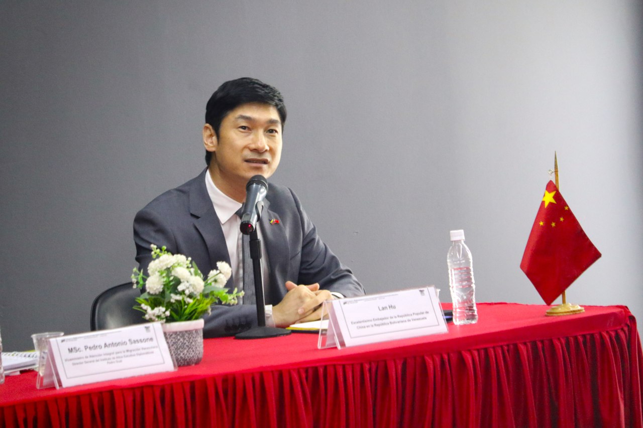 Hu estuvo acompañado por viceministro de Atención Integral para la Migración Venezolana del Ministerio del Poder Popular para Relaciones Exteriores y director general del Instituto de Altos Estudios Diplomáticos “Pedro Gual” (IAEDPG), Pedro Sassone, y el diputado de la Asamblea Nacional y presidente del Grupo Parlamentario China-Venezuela, Rodolfo Sanz.