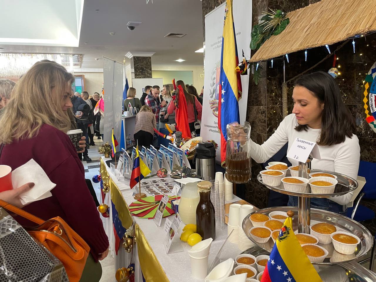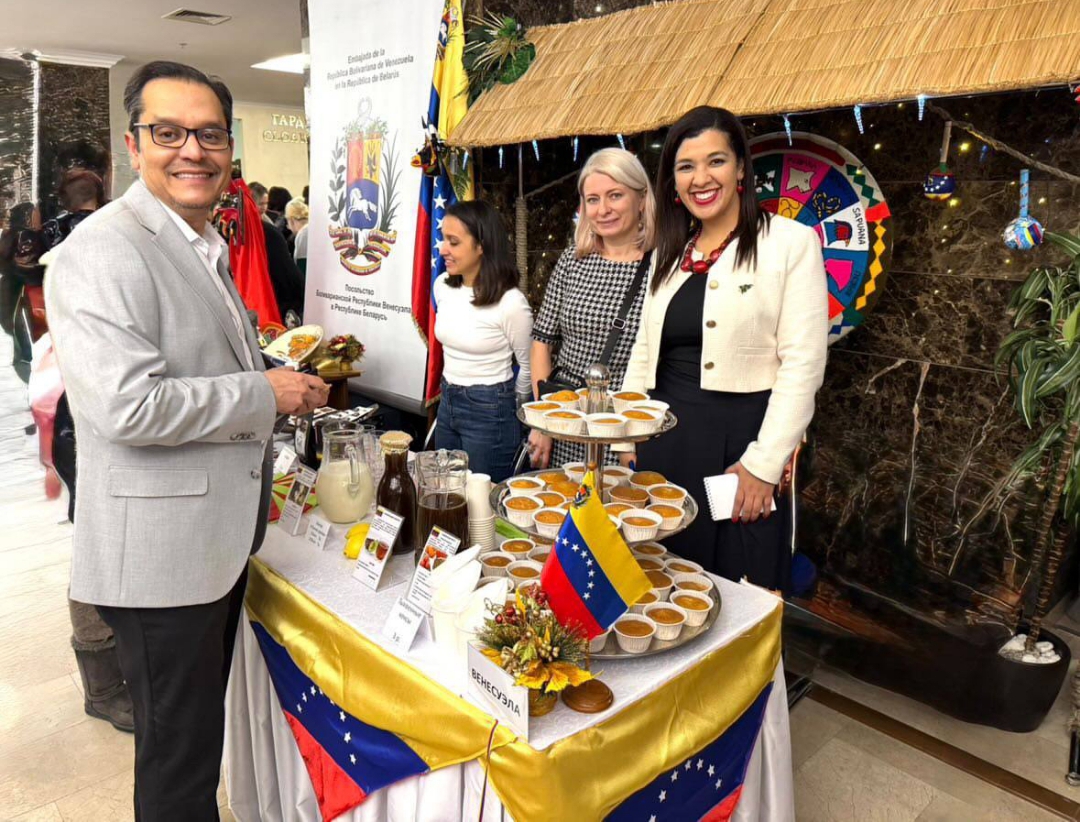 La República Bolivariana de Venezuela llega con su tradicional colorido y sabor al Bazar benéfico de Navidad de Minsk. La Embajada en la República de Belarús y el Centro Cultural Latinoamericano “Simón Bolívar” de Minsk expusieron el amplio acervo cultural venezolano, con bellas muestras de artesanía popular, haciendo especial énfasis en la proyección de la gastronomía nacional, presentando bebidas como el ponche crema y el papelón con limón, sin olvidar el rico cafecito “guayoyo”, además de tortas de auyama.