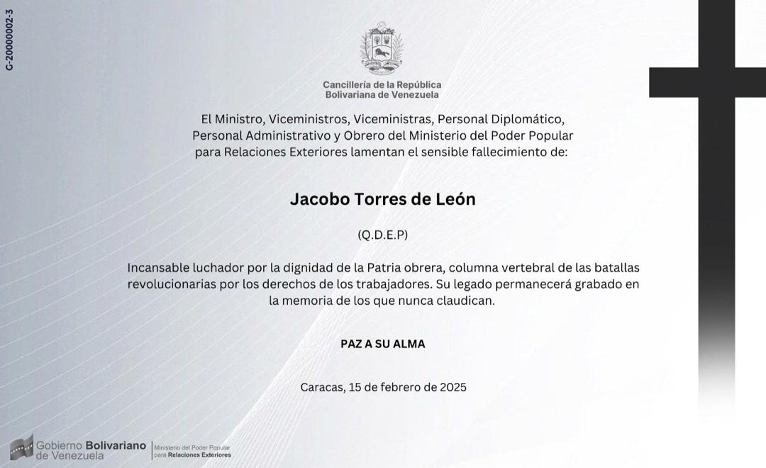 El Ministerio del Poder Popular para Relaciones Exteriores se une al duelo de familiares, amigos y camaradas del diputado Jacobo Torres de León, quien partió físicamente ayer sábado a los 62 años.