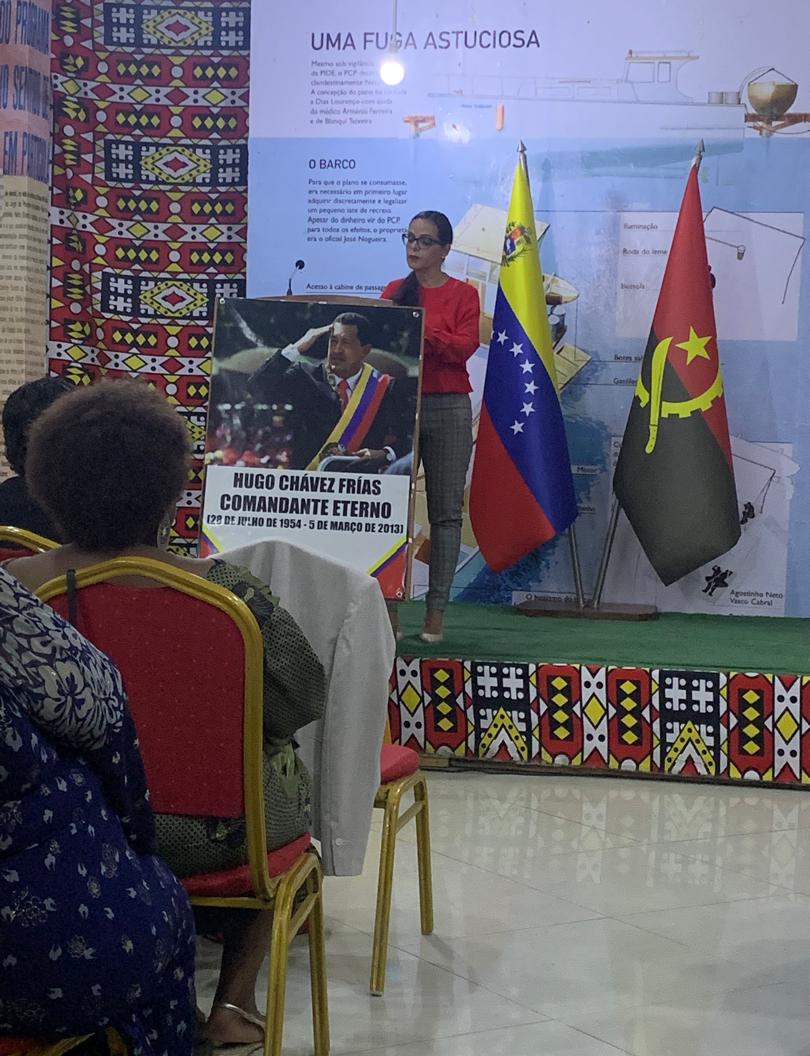 Durante su intervención, la embajadora de Venezuela en Angola, Belén Teresa Orsini Pic, destacó el legado del Comandante Chávez, resaltando su vida dedicada al pueblo venezolano, a la unión de la Patria Grande y en el ámbito internacional, como una voz contundente que siempre denunció el capitalismo, imperialismo, colonialismo y el fascismo como grandes enemigos de la humanidad.