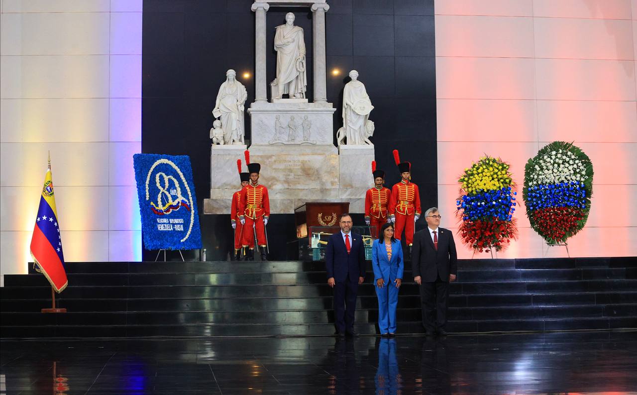 Con motivo del 80° aniversario del establecimiento de las relaciones diplomáticas entre la República Bolivariana de Venezuela y la Federación de Rusia, la vicepresidenta ejecutiva de la República, Delcy Rodríguez; el ministro del Poder Popular para Relaciones Exteriores, Yván Gil, y el embajador ruso ante el país, Sergey Mélik- Bagdasárov, encabezaron este viernes una ceremonia de ofrenda floral al Padre de la Patria, Simón Bolívar, en el Panteón Nacional de Caracas.