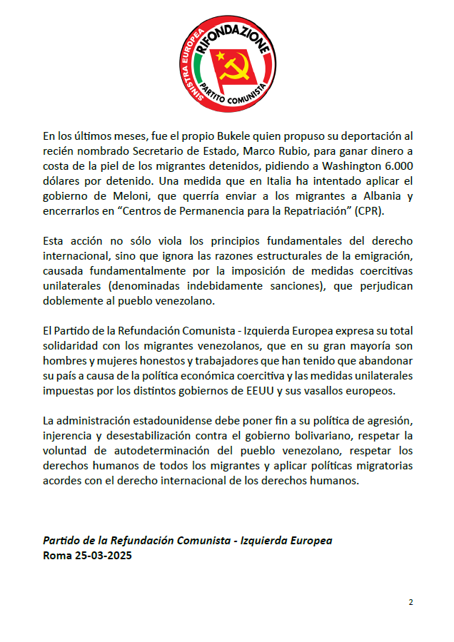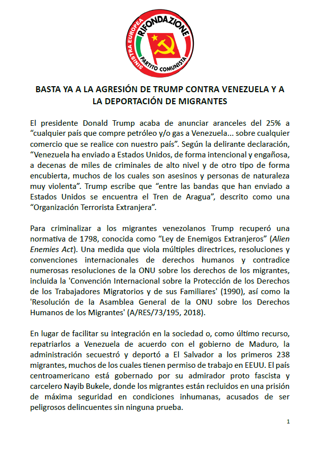 Asimismo, el Partido de la Refundación Comunista – Izquierda Europea se pronunció en contra de la agresión económica y política contra Venezuela, se solidarizó con los migrantes venezolanos y denunció la hipocresía de sectores de la extrema derecha que promovieron sanciones que devastaron la economía venezolana, forzando la migración masiva. «Los políticos que pidieron sanciones hoy disfrutan de lujos en el extranjero, mientras los migrantes (venezolanos) sufren xenofobia y abusos», denunció.