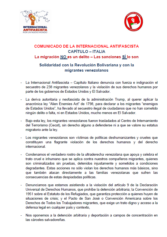 Por su parte, la Internacional Antifascista - Capítulo Italia denunció el secuestro de los 238 migrantes venezolanos, así como las violaciones sistemáticas de sus DDHH en Estados Unidos y El Salvador: “La administración Trump reactivó la obsoleta “Alien Enemies Act” de 1798 para criminalizar y perseguir a los migrantes venezolanos, trasladándolos sin debido proceso al Centro de Confinamiento del Terrorismo (Cecot) en condiciones inhumanas”.