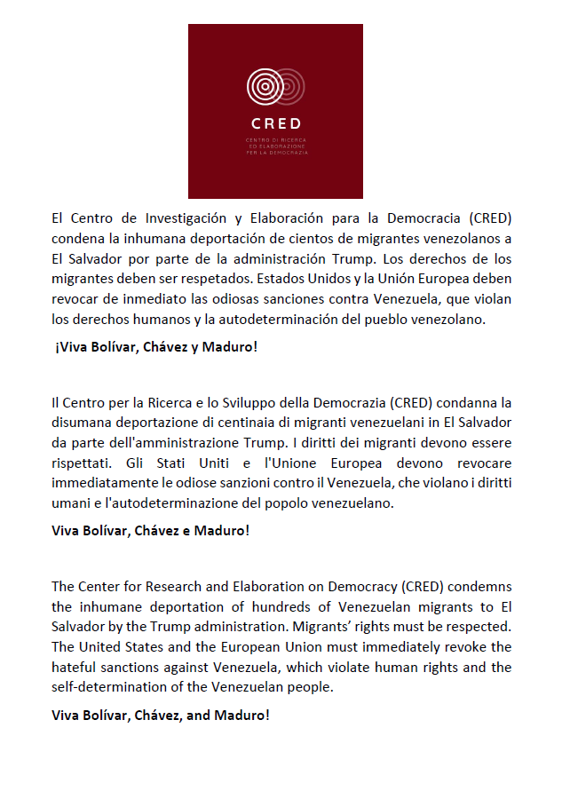 Diversas organizaciones y fuerzas políticas italianas han manifestado su solidaridad con el pueblo venezolano y denunciado las injusticias cometidas contra los migrantes venezolanos. El Centro de Investigación y Elaboración para la Democracia (CRED) condenó enérgicamente la deportación de cientos de migrantes venezolanos hacia El Salvador, perpetrada por la administración de Donald Trump en los Estados Unidos.