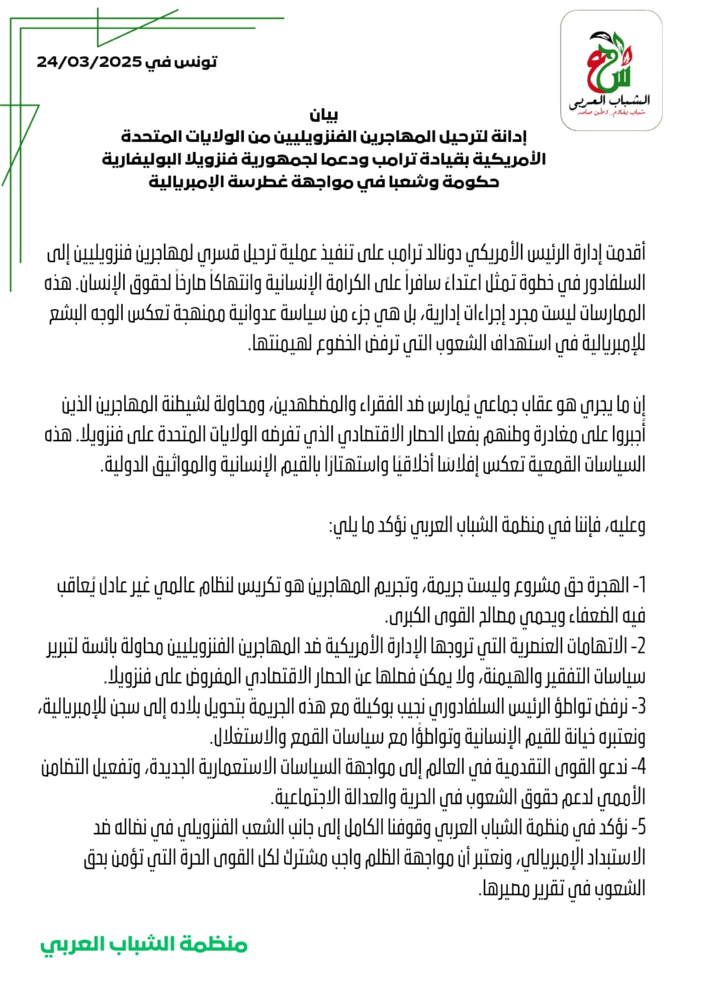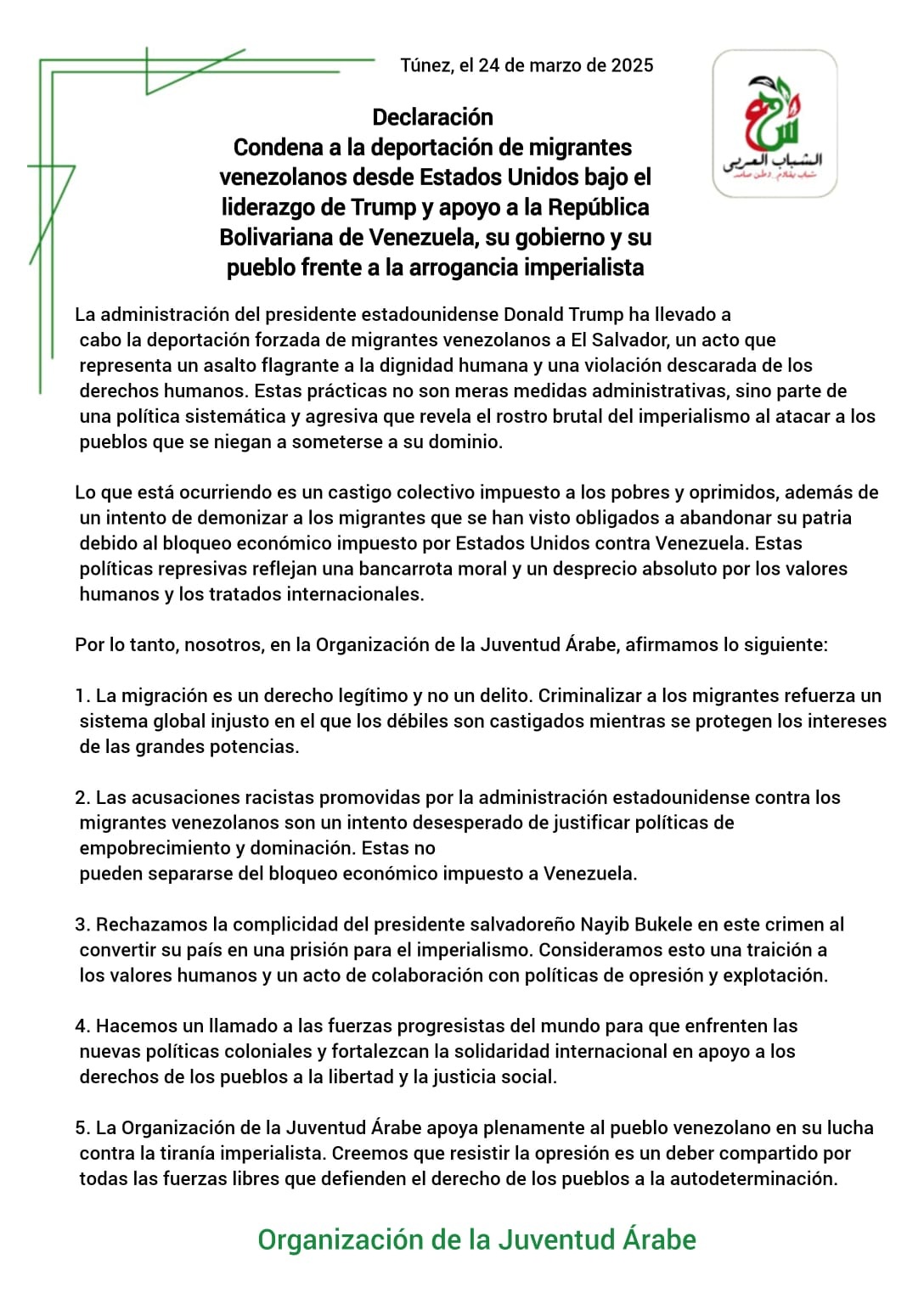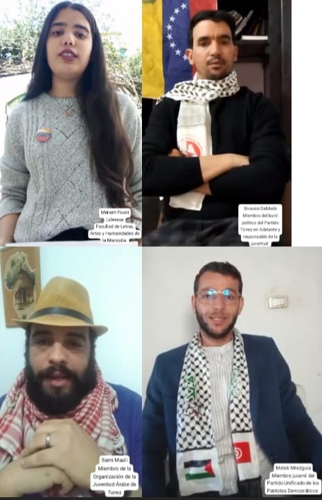 Asimismo, Meriem Founi, lideresa estudiantil, denunció que las mujeres y jóvenes venezolanas son víctimas de una represión arbitraria disfrazada de política migratoria, por lo que rechaza esta opresión misógina; mientras que Sami Maali, miembro de la Organización de la Juventud Árabe de Túnez, condenó la violación estadounidense del derecho internacional y de los principios de los derechos humanos y la implicación del presidente salvadoreño, Nayib Bukele, en esta acción despreciable que convierte las cárceles de su país en una prisión para las víctimas del imperialismo y el fascismo en el mundo.