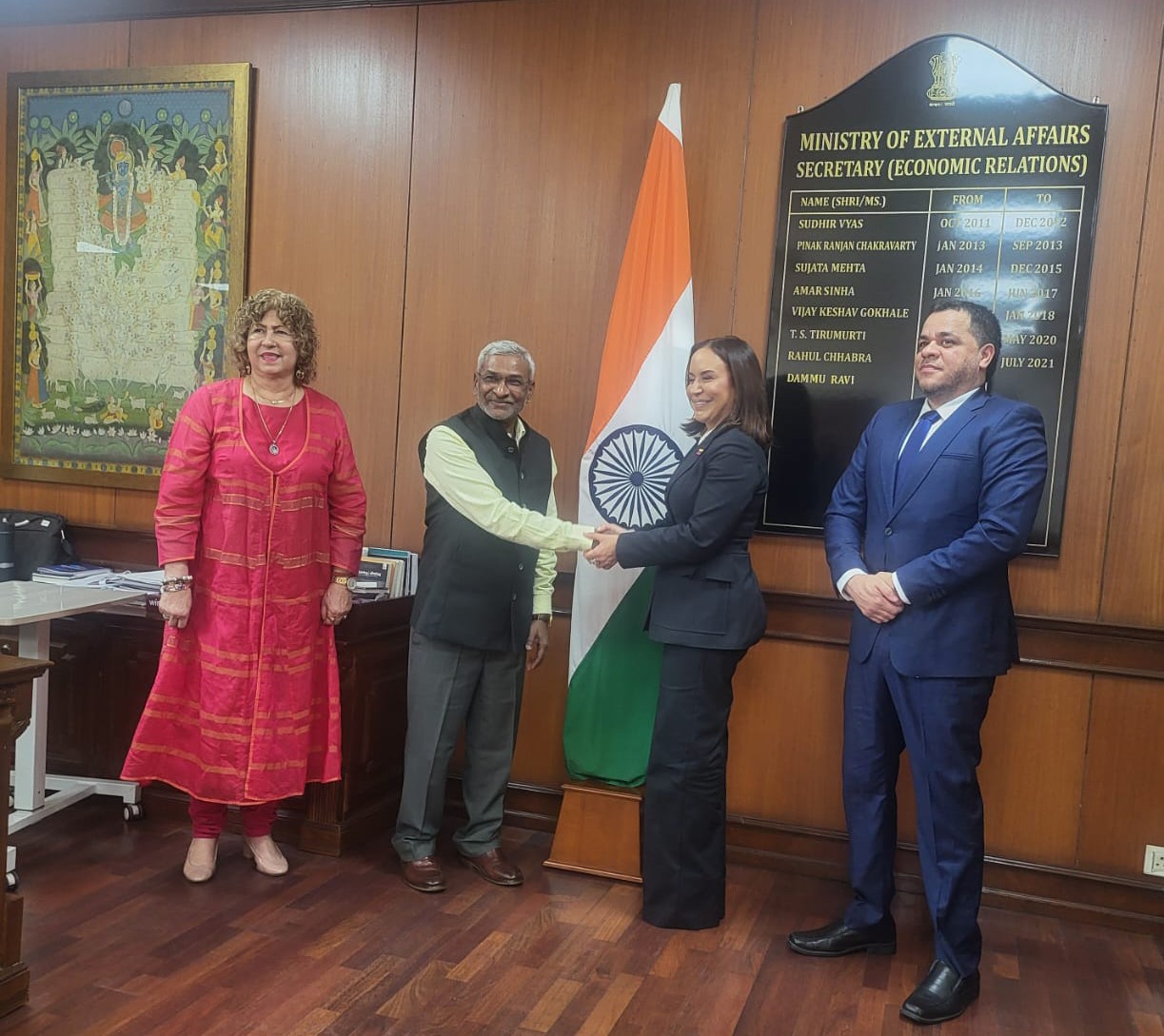La viceministra de Relaciones Exteriores para Asia, Medio Oriente y Oceanía, Tatiana Pugh Moreno, mantuvo un productivo encuentro con el secretario adjunto, K.M. Praphullachandra Sharma, jefe de la División de América Latina y el Caribe de la Cancillería india