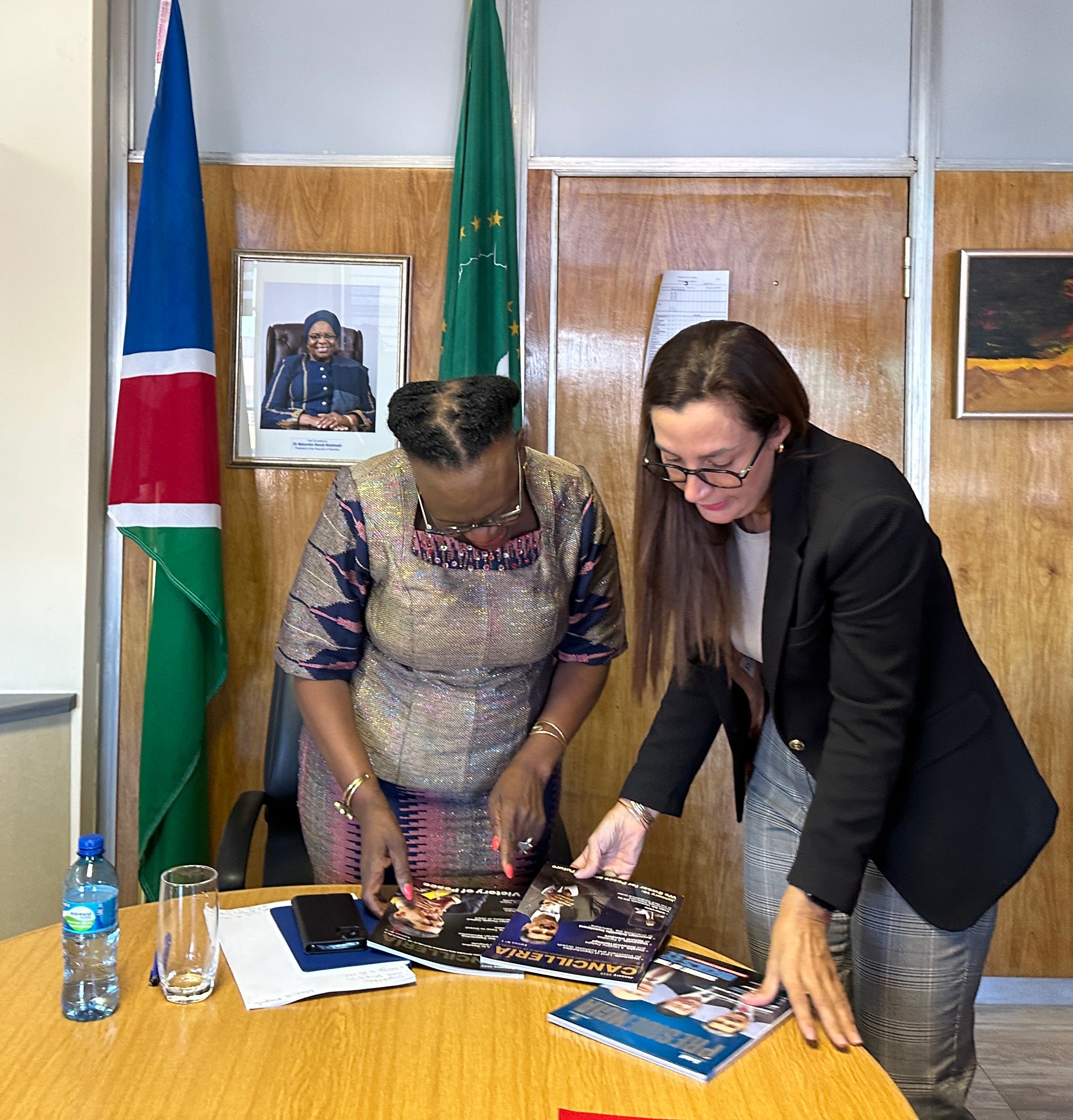 La embajadora de la República Bolivariana de Venezuela, Magaly Josefina Henríquez González, se reunió con la nueva ministra de Relaciones Internacionales y Comercio de la República de Namibia, embajadora Selma Ashipala-Musavyi, en función de refrendar la amistad histórica entre ambos países.