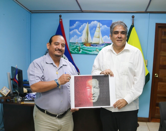 El embajador Argote recordó el legado de cooperación impulsado por el Comandante Hugo Chávez, especialmente mediante Petrocaribe, y agradeció el apoyo de Belice contra las medidas coercitivas unilaterales impuestas a Venezuela por el imperialismo occidental, al tiempo que obsequió al Alcalde una serigrafía titulada “Presencia”, en la cual se plasma el rostro del Comandante Hugo Chávez, realizada en homenaje a los obreros petroleros de PDVSA.