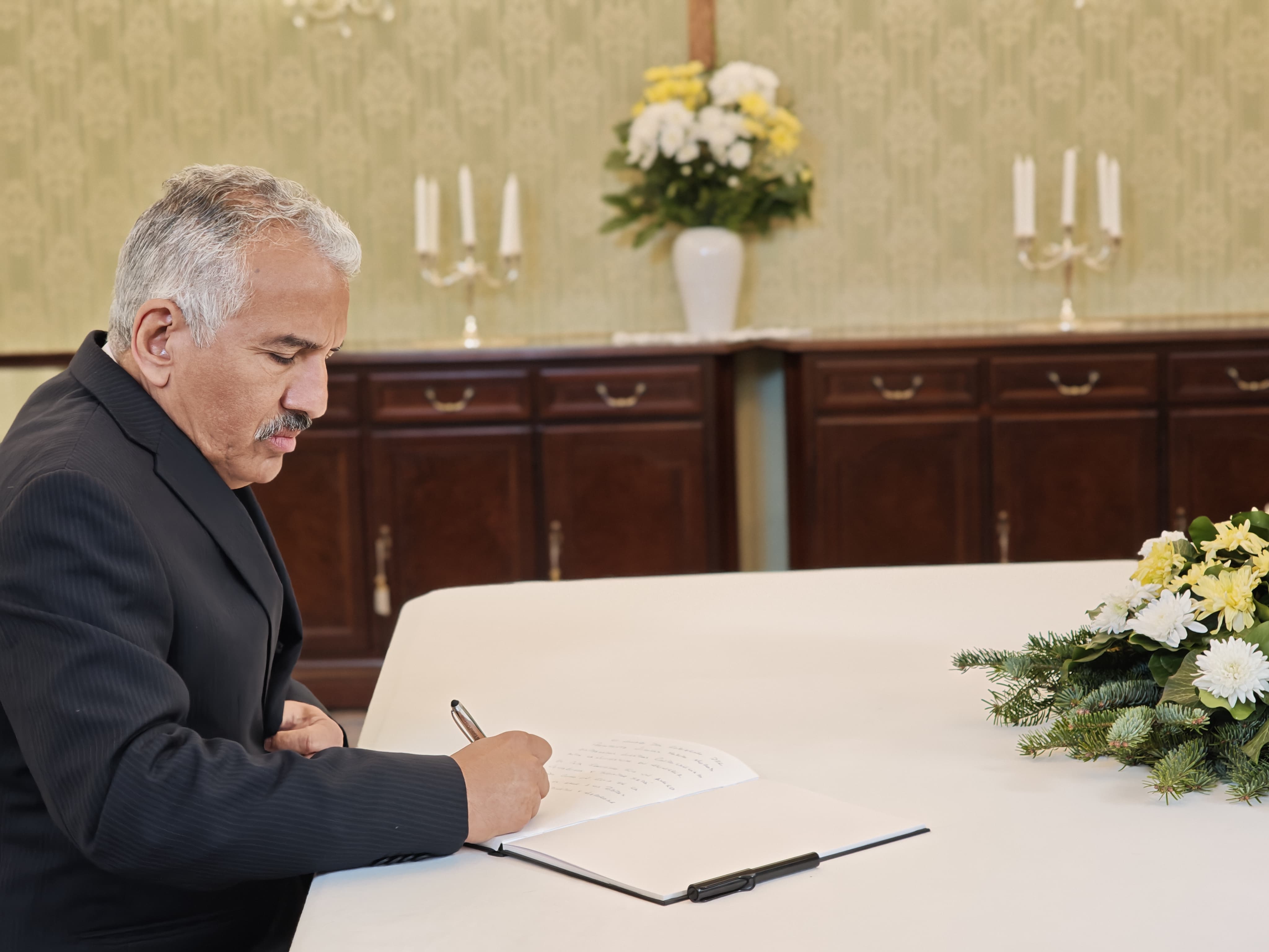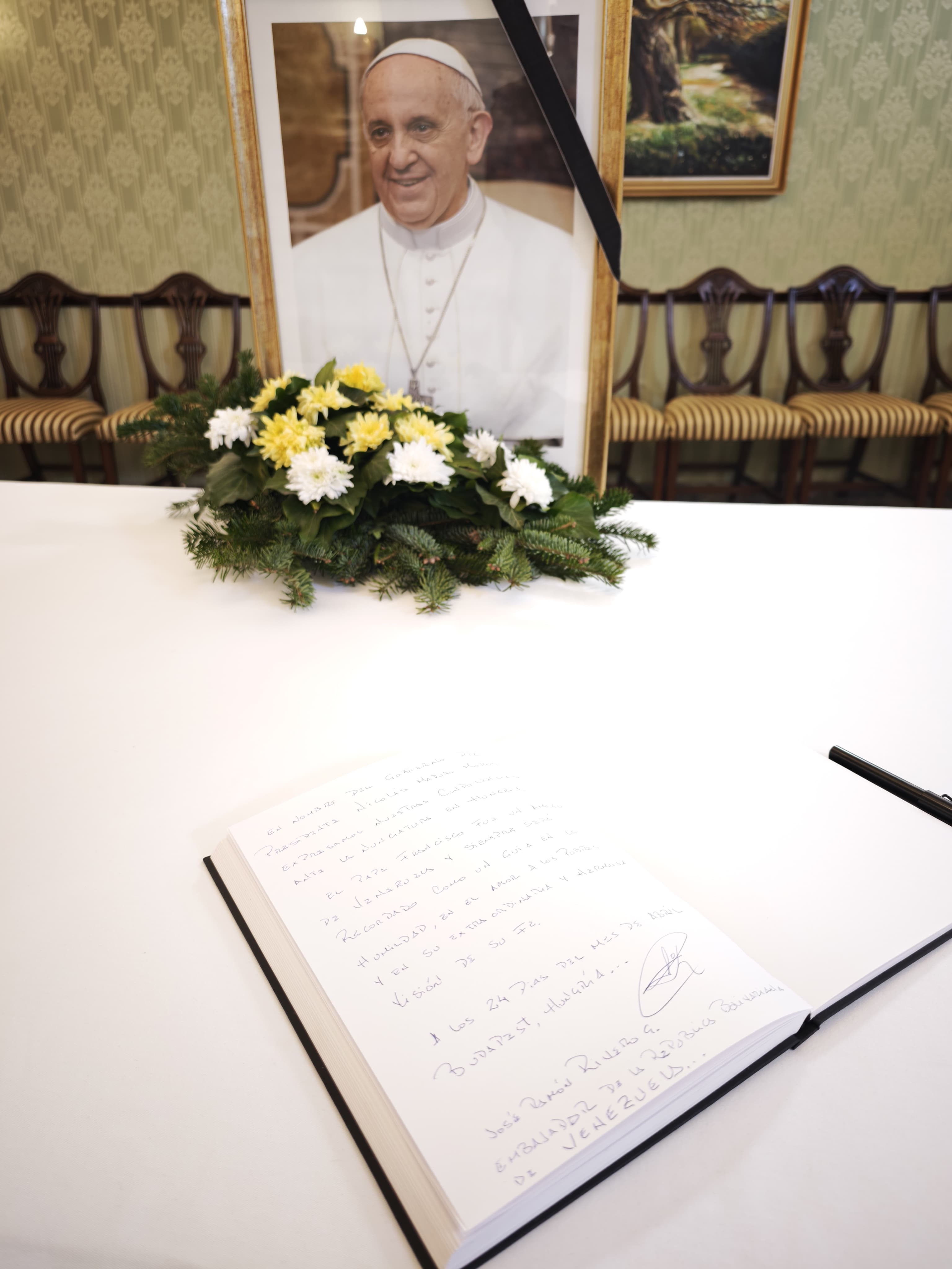 Previo a la firma, el Jefe de Misión entregó al Nuncio Apostólico y decano del Cuerpo Diplomático acreditado en Hungría, Michael W. Banach, el Comunicado Oficial emitido ante el fallecimiento del Sumo Pontífice e informó acerca del decreto del Gobierno Bolivariano de tres días de duelo nacional con motivo de esta luctuosa ocasión.