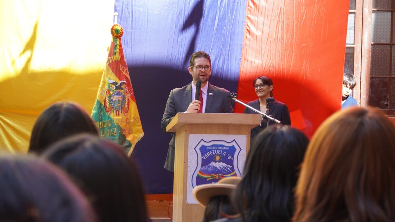 El embajador de la República Bolivariana de Venezuela ante el Estado Plurinacional de Bolivia, César Trómpiz, visitó la Unidad Educativa "Venezuela B", ubicada en la ciudad de La Paz, como parte de una jornada educativa y cultural promovida por la directiva del plantel junto con los asesores de la promoción 2025.