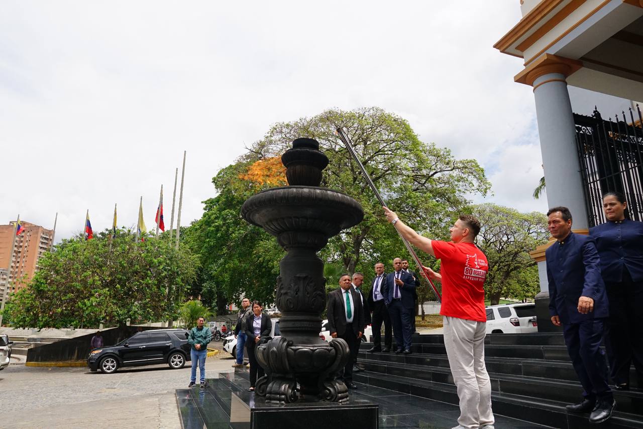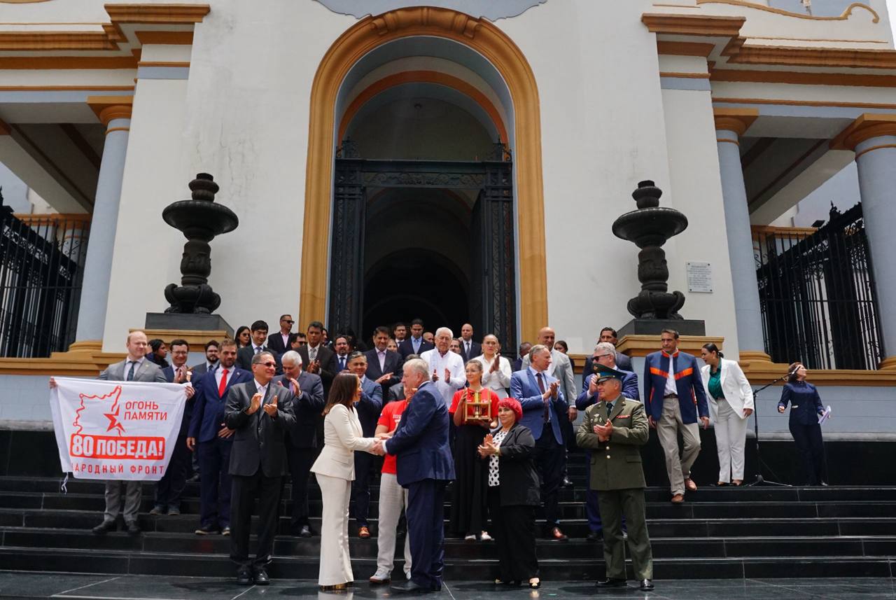 Al finalizar el acto protocolar, encendieron la réplica de la Llama Eterna en los bebederos del Panteón Nacional, traída desde la Tumba del Soldado Desconocido en Moscú por el representante del Frente Popular, Pavel Berezhansky, como símbolo de la amistad, resistencia y verdad histórica que unen a ambos pueblos.