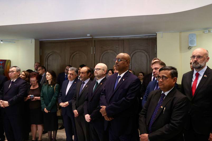 Durante el evento, celebrado en la sede de la Cancillería bielorrusa, se inauguró una exposición de arte con temática militar, en la cual se resalta el papel fundamental del arte en la conservación de la memoria histórica.
