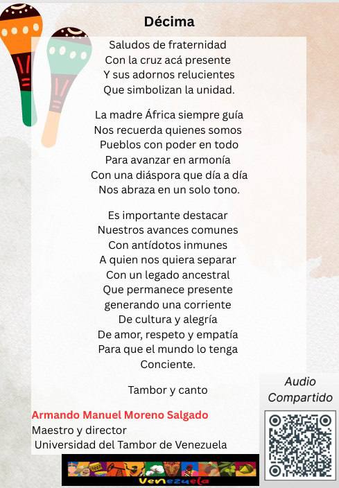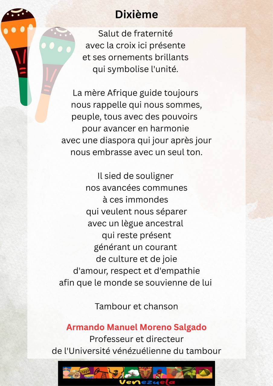 Finalmente, los asistentes declamaron en castellano y en francés una Décima del maestro y director del Grupo Herencia de Venezuela, Armando Manuel Moreno Salgado.