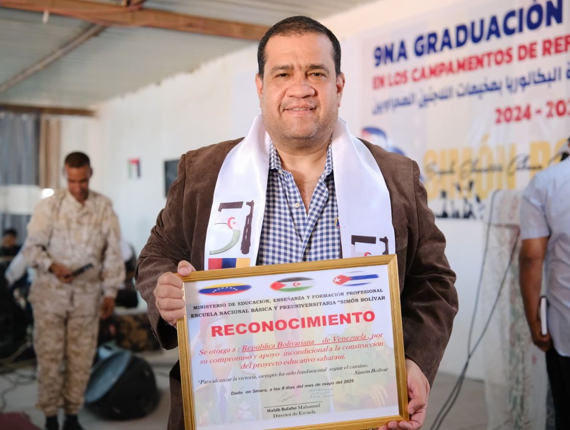 La Quinta Brigada Venezolana de Solidaridad con el Pueblo Saharaui, junto con el encargado de Negocios de la Embajada de la República Bolivariana de Venezuela en Argel, Gabriel Torrealba, asistieron al acto de grado de la 9na promoción de bachilleres de la Escuela “Simón Bolívar” en Smara. Este emotivo evento reflejó los lazos de hermandad y cooperación entre Venezuela y el pueblo saharaui.