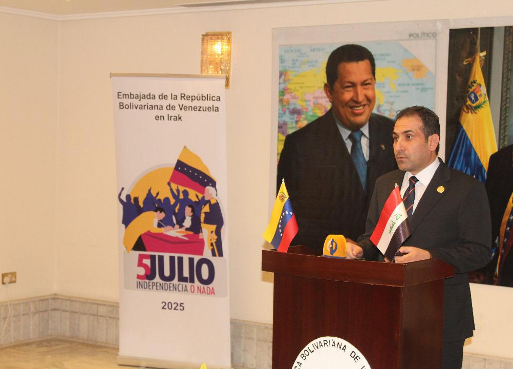 Bagdad, 5 de julio de 2025.- En el marco de la celebración de los 214 años de la Independencia de la República Bolivariana de Venezuela, el embajador Arturo Aníbal Gallegos Ramírez organizó una conferencia para presentar la iniciativa del Presidente Nicolás Maduro de convocar una Cumbre de Líderes Mundiales por la Paz y contra la Guerra.