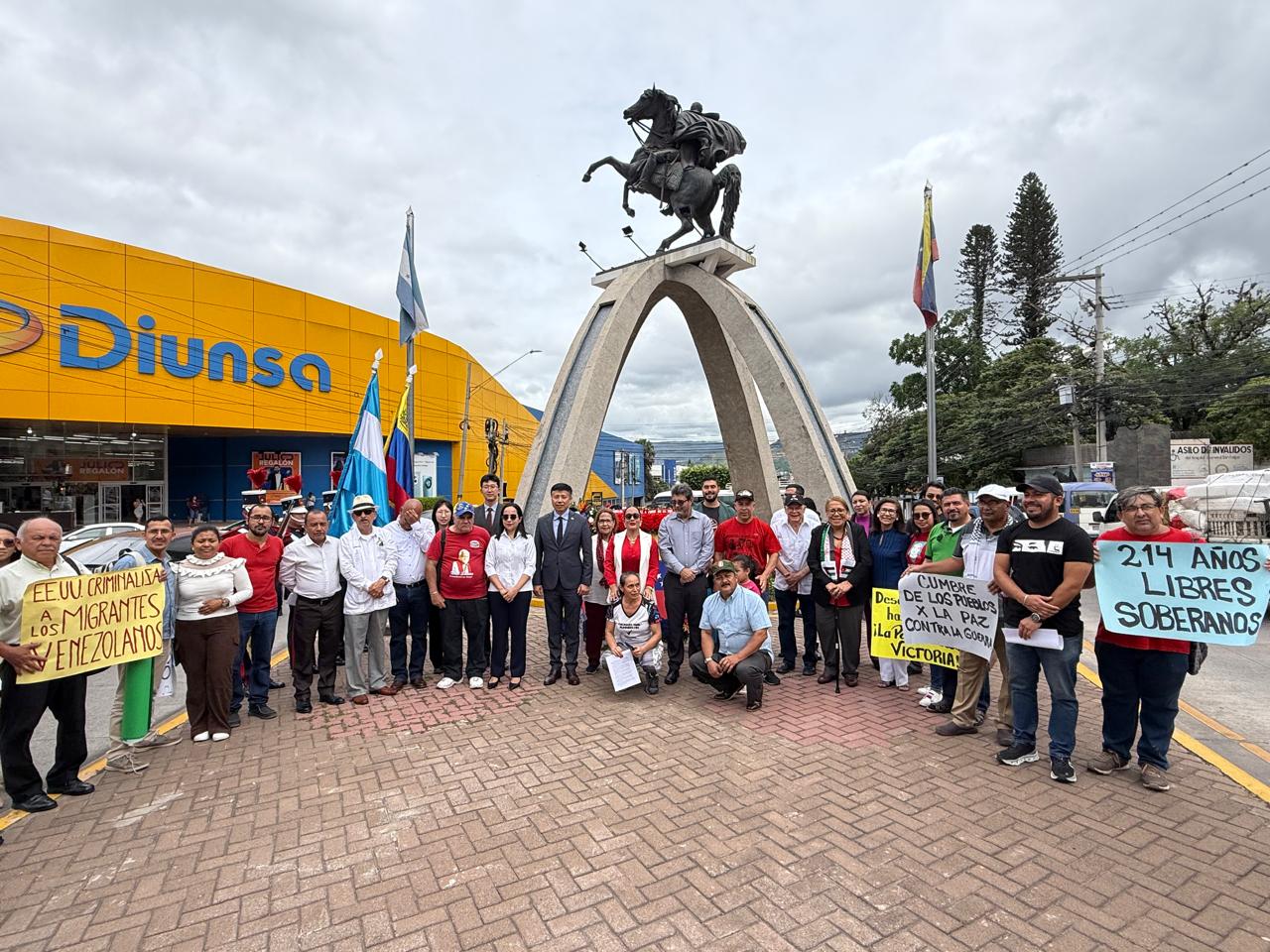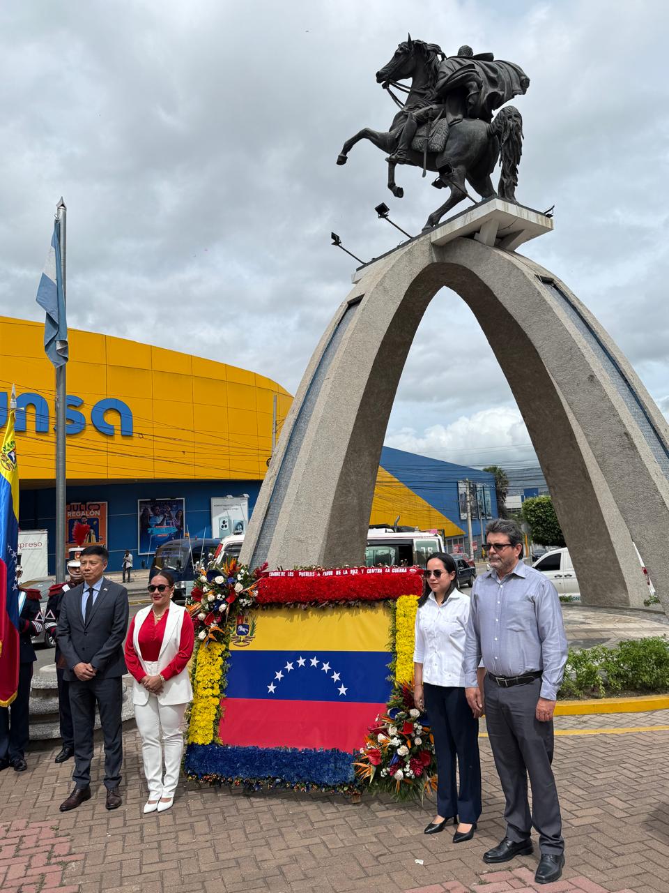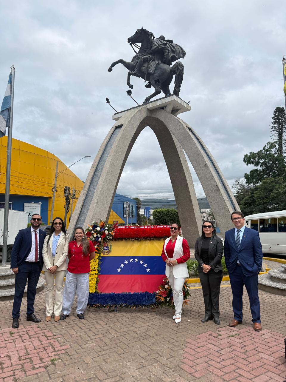 Tegucigalpa, 4 de julio de 2025.- Este viernes, frente a la imponente estatua ecuestre del Libertador Simón Bolívar, en el Paseo de los Próceres de Tegucigalpa, la Embajada de la República Bolivariana de Venezuela realizó un acto de colocación de ofrenda floral con motivo del 214 aniversario de la Firma del Acta de la Independencia, reafirmando el compromiso histórico con la libertad, la autodeterminación de los pueblos y la Paz en el mundo, como principios de la diplomacia bolivariana.