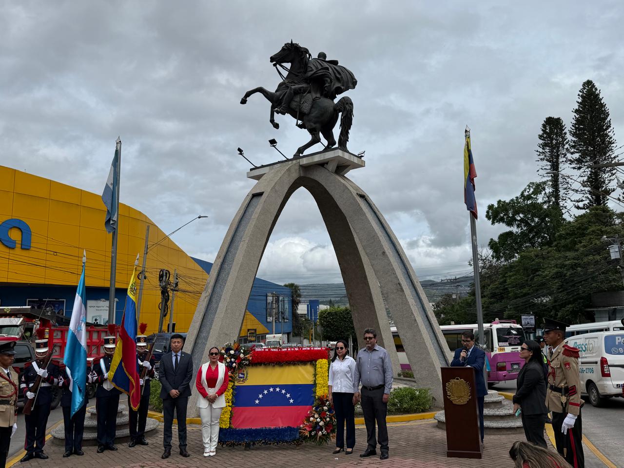 La ceremonia incluyó la entonación de los himnos nacionales de Honduras y Venezuela, y la colocación de una ofrenda floral ante el monumento bolivariano.