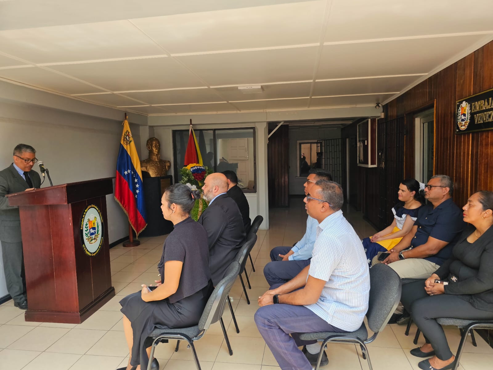 Georgetown, 5 de julio de 2025.- En la sede de la Embajada de la República Bolivariana de Venezuela en Georgetown, se realizó el acto solemne para conmemorar el 214 aniversario del 5 de Julio de 1811, día histórico que marcó el inicio de la gesta heroica hacia la independencia del país suramericano.