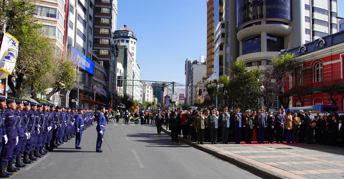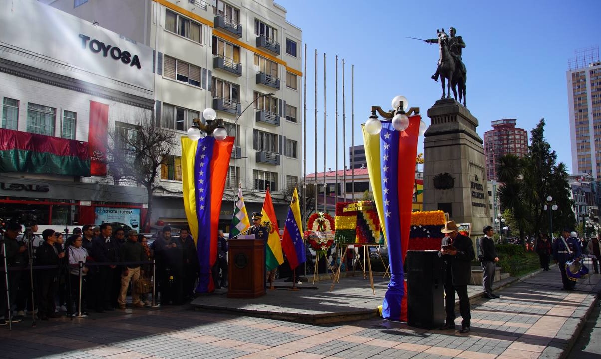 El homenaje tuvo lugar en la Plaza Venezuela del Paseo El Prado, centro histórico de la ciudad de La Paz, ante el monumento erigido en honor al Padre de la Patria.