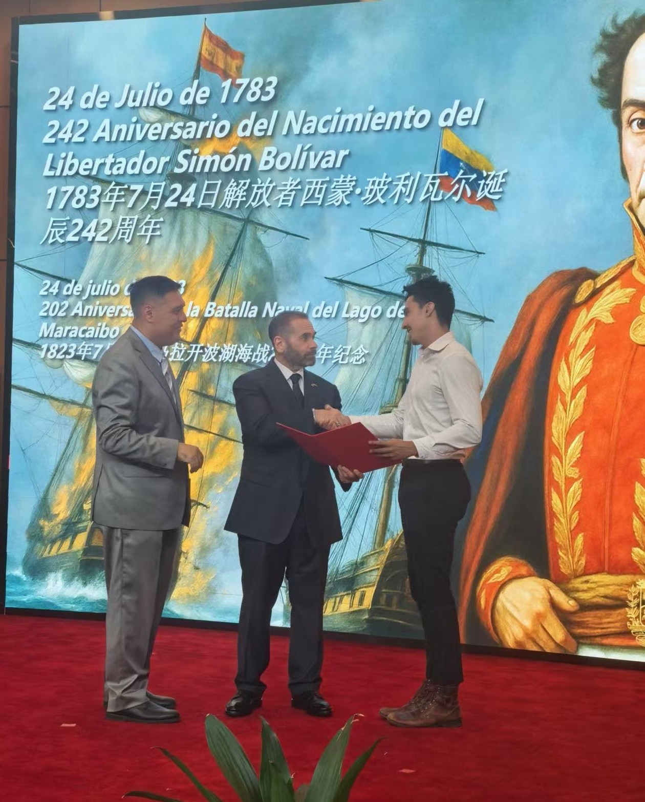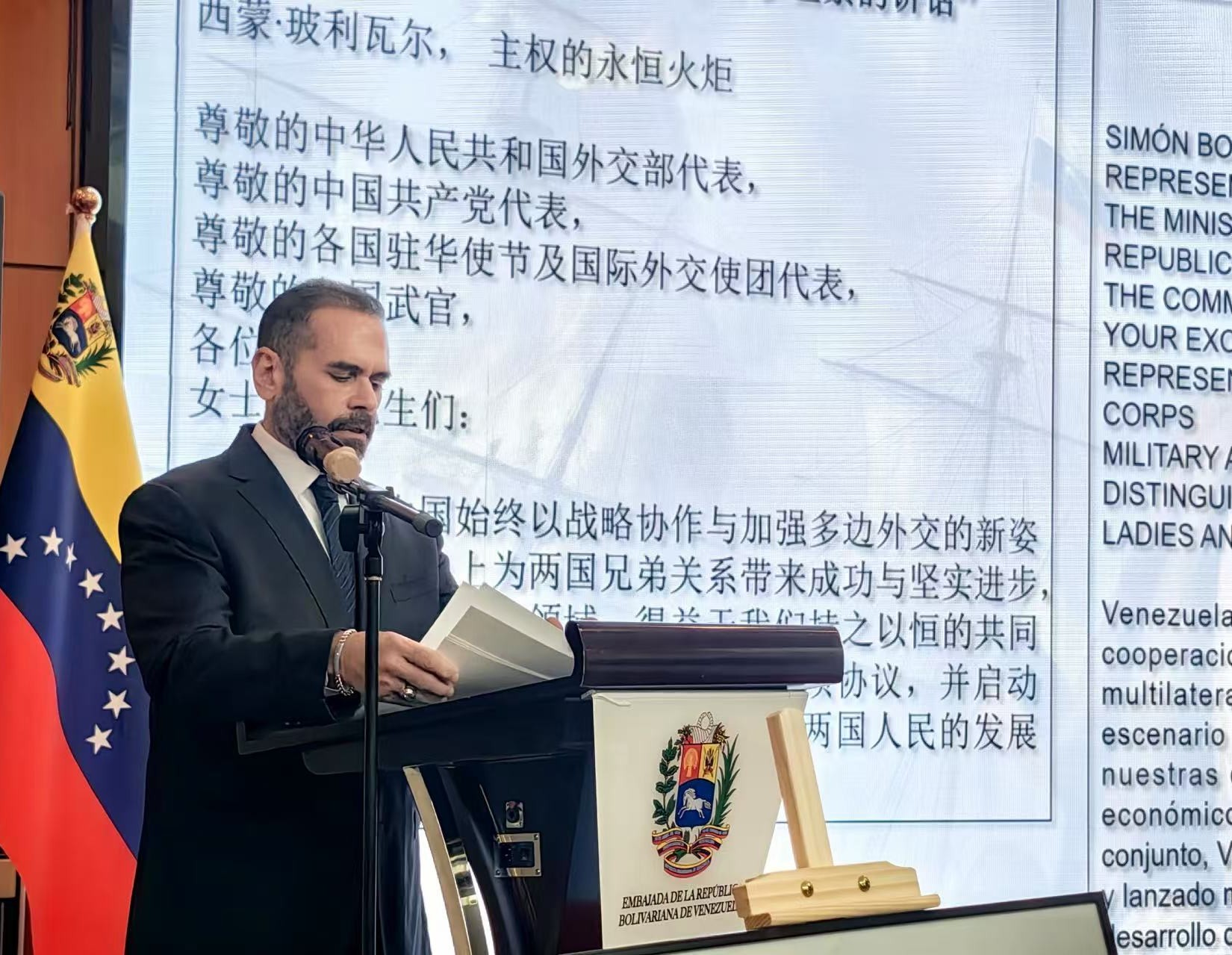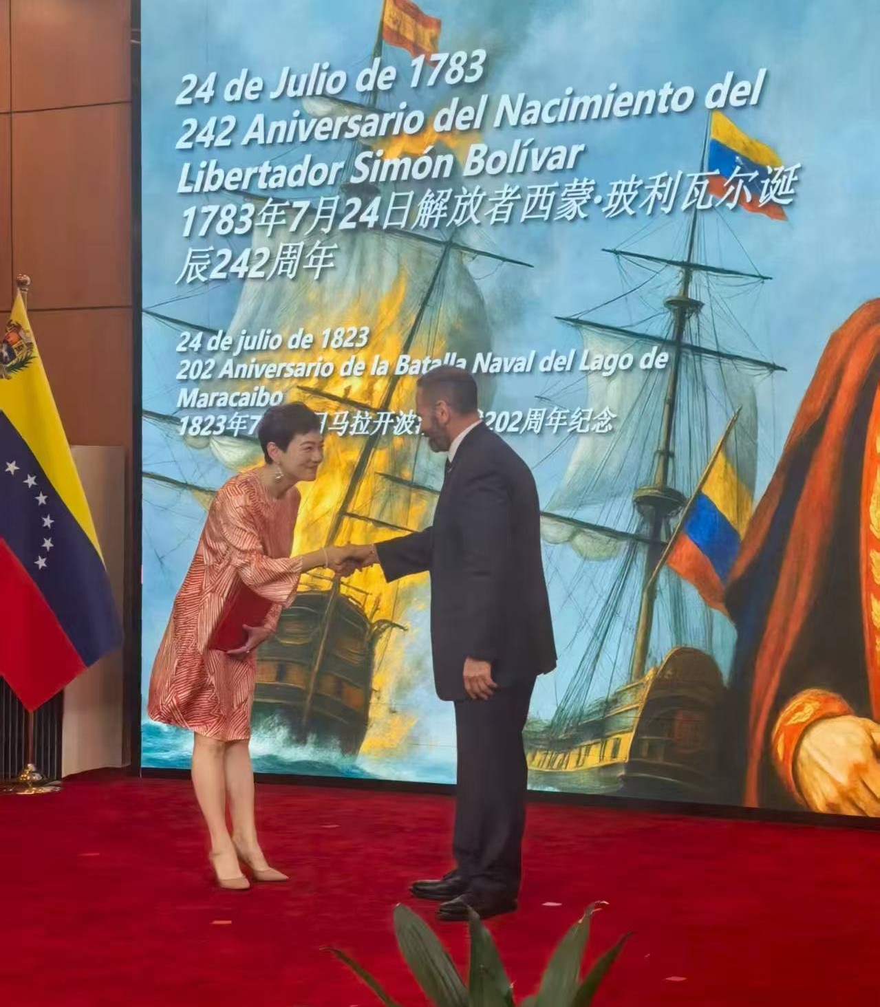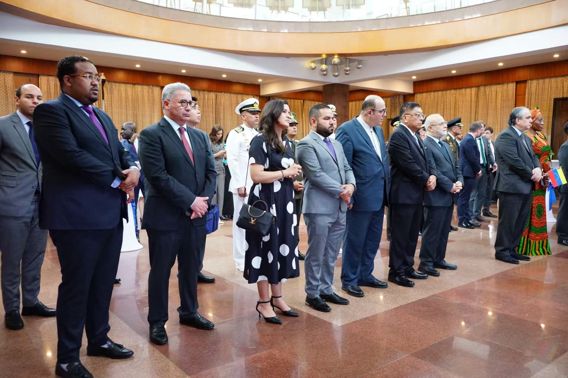 Beijing, 24 de julio de 2025.- En un acto solemne celebrado en la ciudad de Beijing, la Embajada de la República Bolivariana de Venezuela conmemoró el 242 aniversario del natalicio del Libertador Simón Bolívar, el Día de la Armada Nacional Bolivariana y el 202 aniversario de la Batalla Naval del Lago de Maracaibo, el cual contó con la participación de representantes del Partido Comunista de China, embajadores, miembros del Cuerpo Diplomático y Agregados Militares acreditados en la República Popular China, e invitados especiales.
