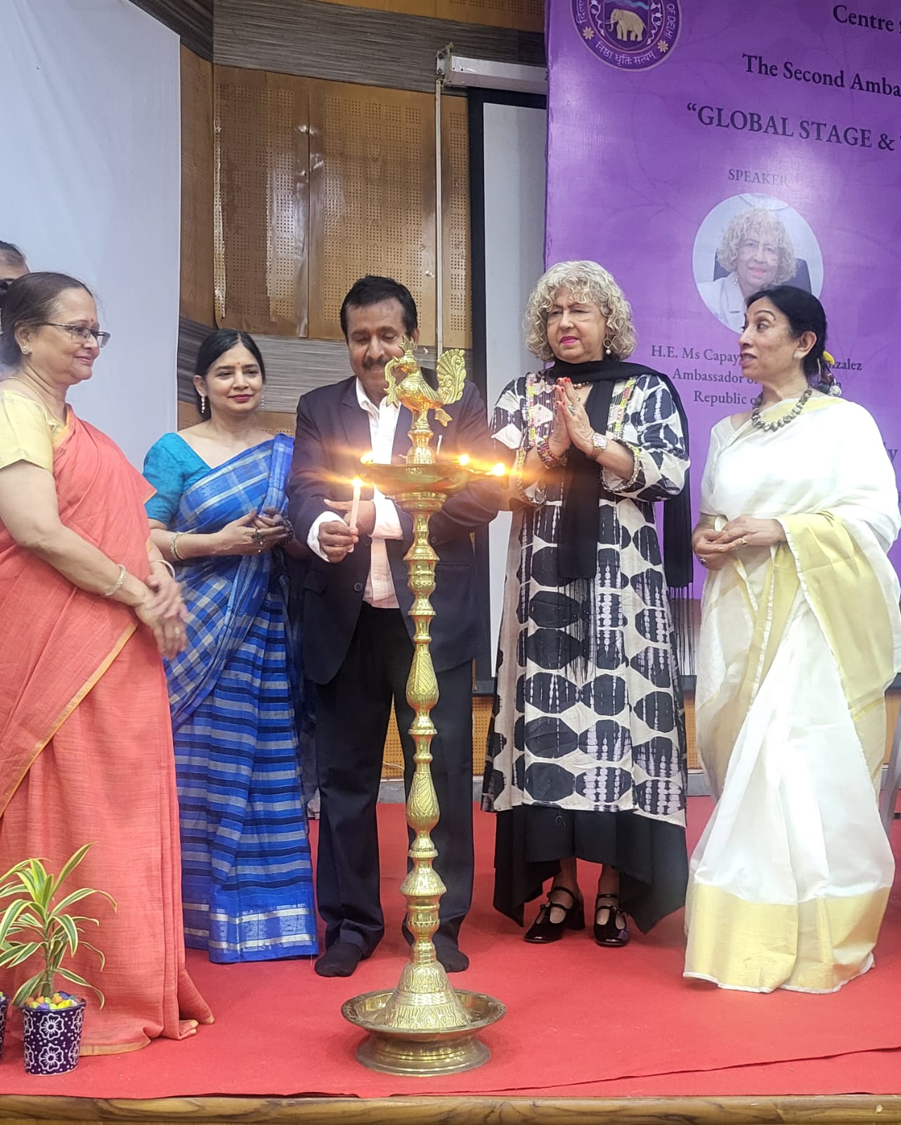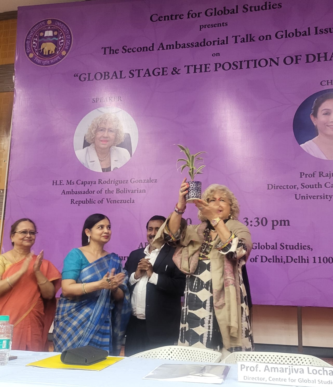 La sesión fue presidida por la profesora Rajni Abbi, directora del Campus Sur de la Universidad de Delhi, y Amarjiva Lochan, decano de la Escuela de Estudios Internacionales y de Estudiantes Extranjeros; ambos estuvieron acompañados por destacadas figuras del ámbito académico de la casa de estudios, entre ellas los profesores Bijayalaxmi, Savita Roy, Dinesh Khattar, Vajala Ravi, Gurmohinder Singh y B.K. Paliwal, autoridades de reconocidos colleges afiliados a la universidad.