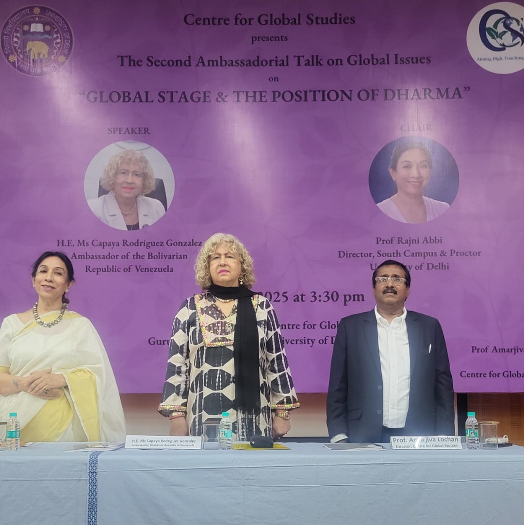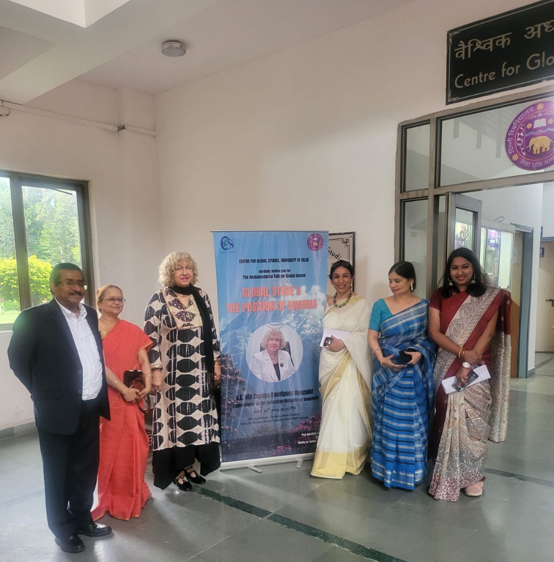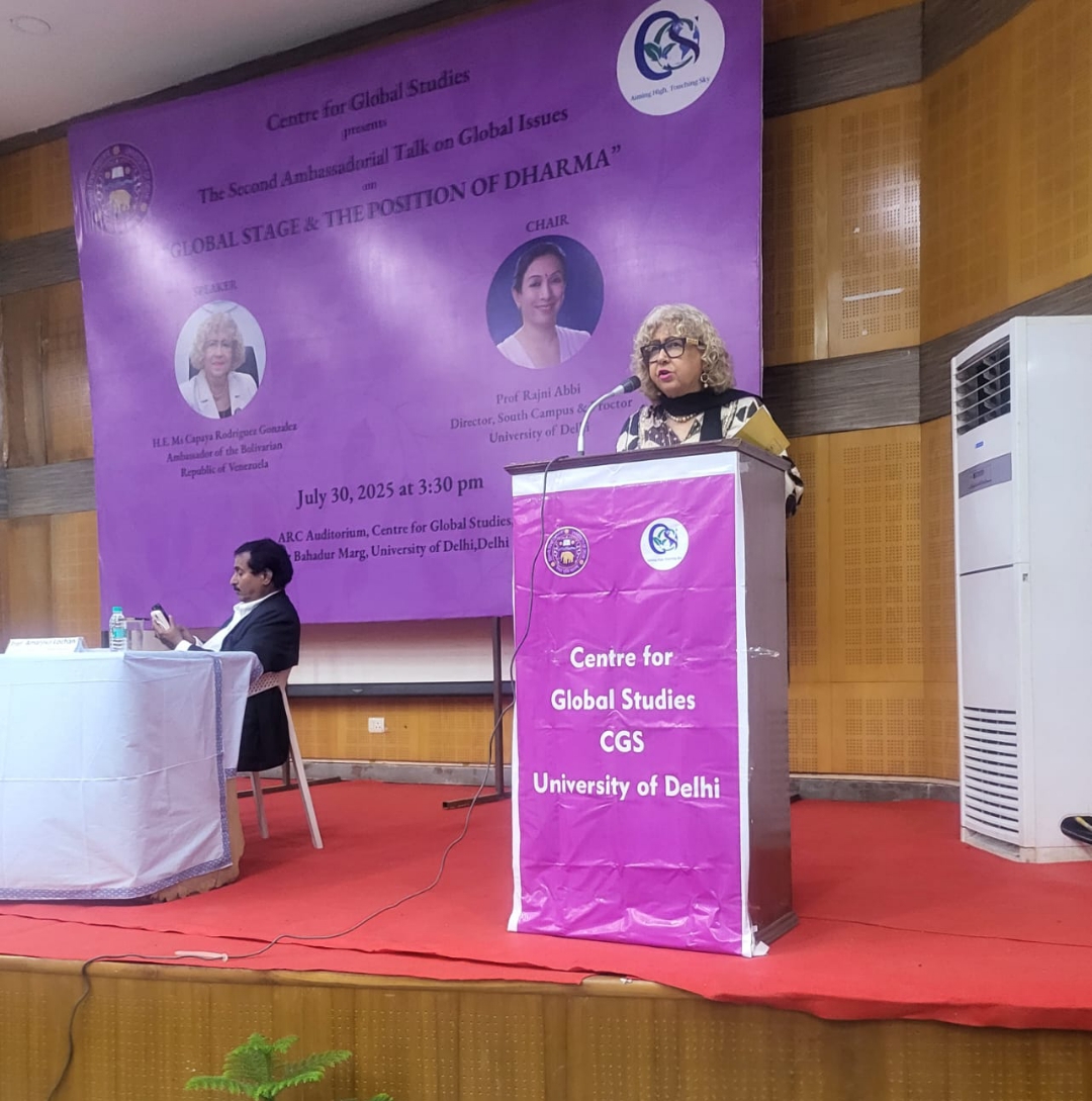En un ambiente cargado de cordialidad, respeto y entusiasmo académico, la embajadora de la República Bolivariana de Venezuela, Capaya Rodríguez González, fue recibida con honores durante su destacada participación en el ciclo de conferencias Ambassadorial Talks, organizado por el Centro de Estudios Globales de la Universidad de Delhi.