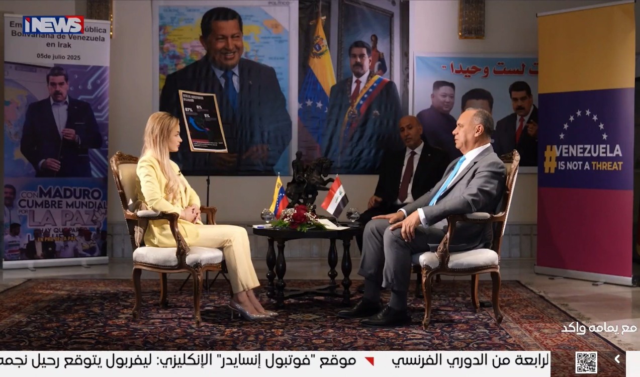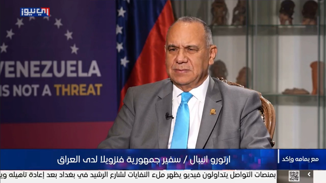 Bagdad, 12 de septiembre de 2025.- En entrevista con la periodista Yamama Wakid, en el programa "Otra Lectura" del canal de televisión iraquí i TV, el embajador de Venezuela, Arturo Gallegos Ramírez, resaltó el liderazgo del Presidente Nicolás Maduros en América Latina y en la relación con los países del Medio Oriente; así como las características democráticas del Proyecto Bolivariano en el marco de las groseras narrativas que intenta imponer el imperialismo de Estados Unidos (EEUU) para apoderarse de las reservas petrolíferas y gasíferas de su país.
