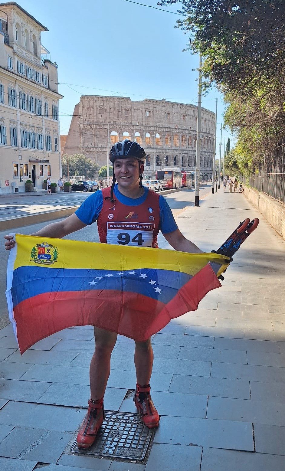 Roma, 16 de septiembre de 2025.- El reconocido esquiador venezolano César Augusto Baena compitió, portando el tricolor nacional, en la tercera etapa de la Copa del Mundo de Rollerski, que se celebró en la Vía del Domus Aurea, al frente del Coliseo de Roma.