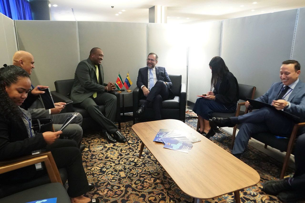 El ministro del Poder Popular para Relaciones Exteriores, Yván Gil, compartió este jueves "un encuentro muy productivo" con su similar de Surinam, Melvin Bouva, en el que "abordamos la importancia de fortalecer estrategias conjuntas para preservar la paz en nuestra región caribeña y proteger la integridad territorial de nuestras naciones".