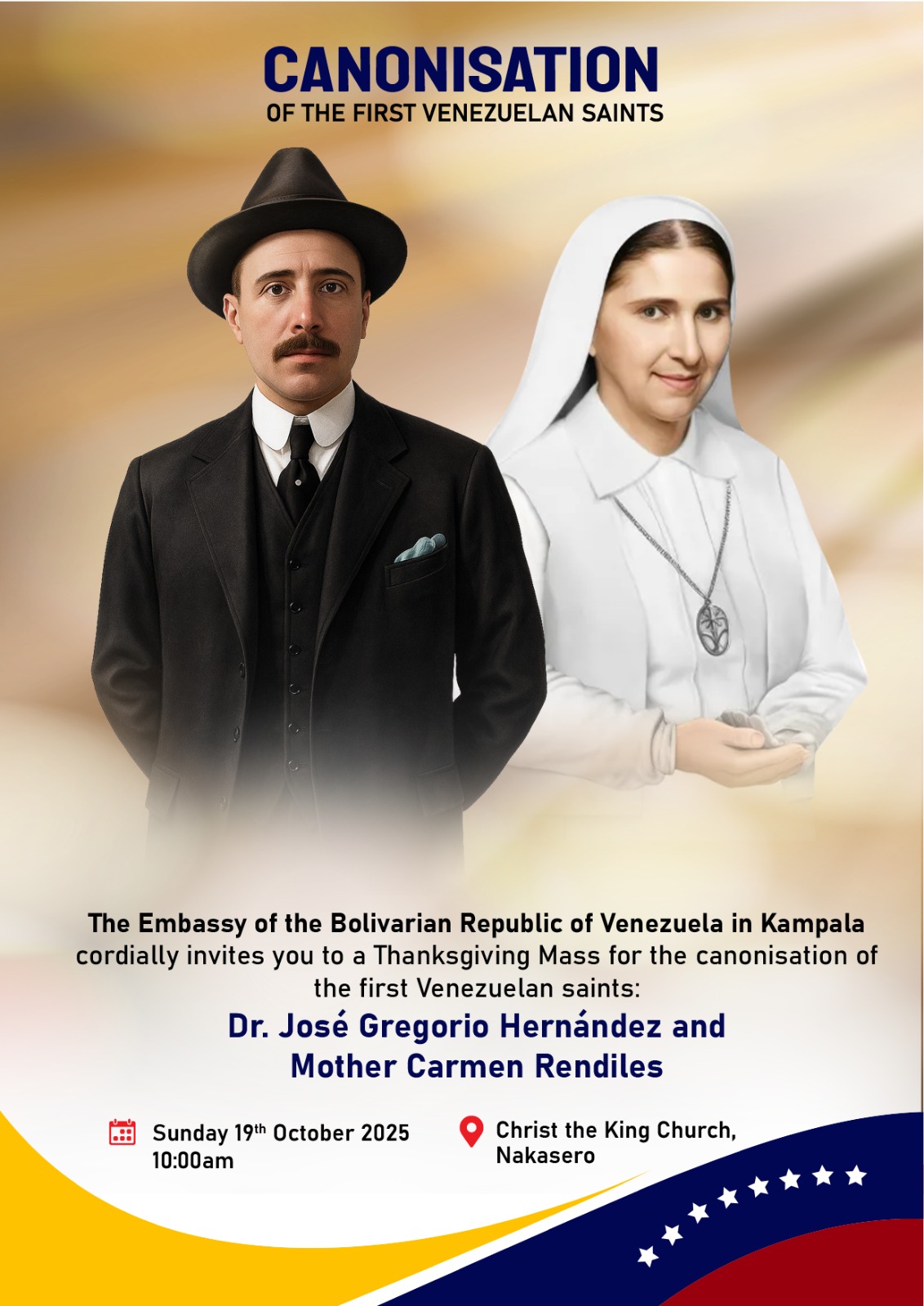 Kampala, 19 de septiembre de 2025.- La Embajada de la República Bolivariana de Venezuela en Uganda celebró este domingo una Misa de Acción de Gracias, en la iglesia Christ the King de Kampala, con motivo de la canonización de San José Gregorio Hernández y Santa Carmen Rendiles Martínez, los primeros santos nacidos en Venezuela.