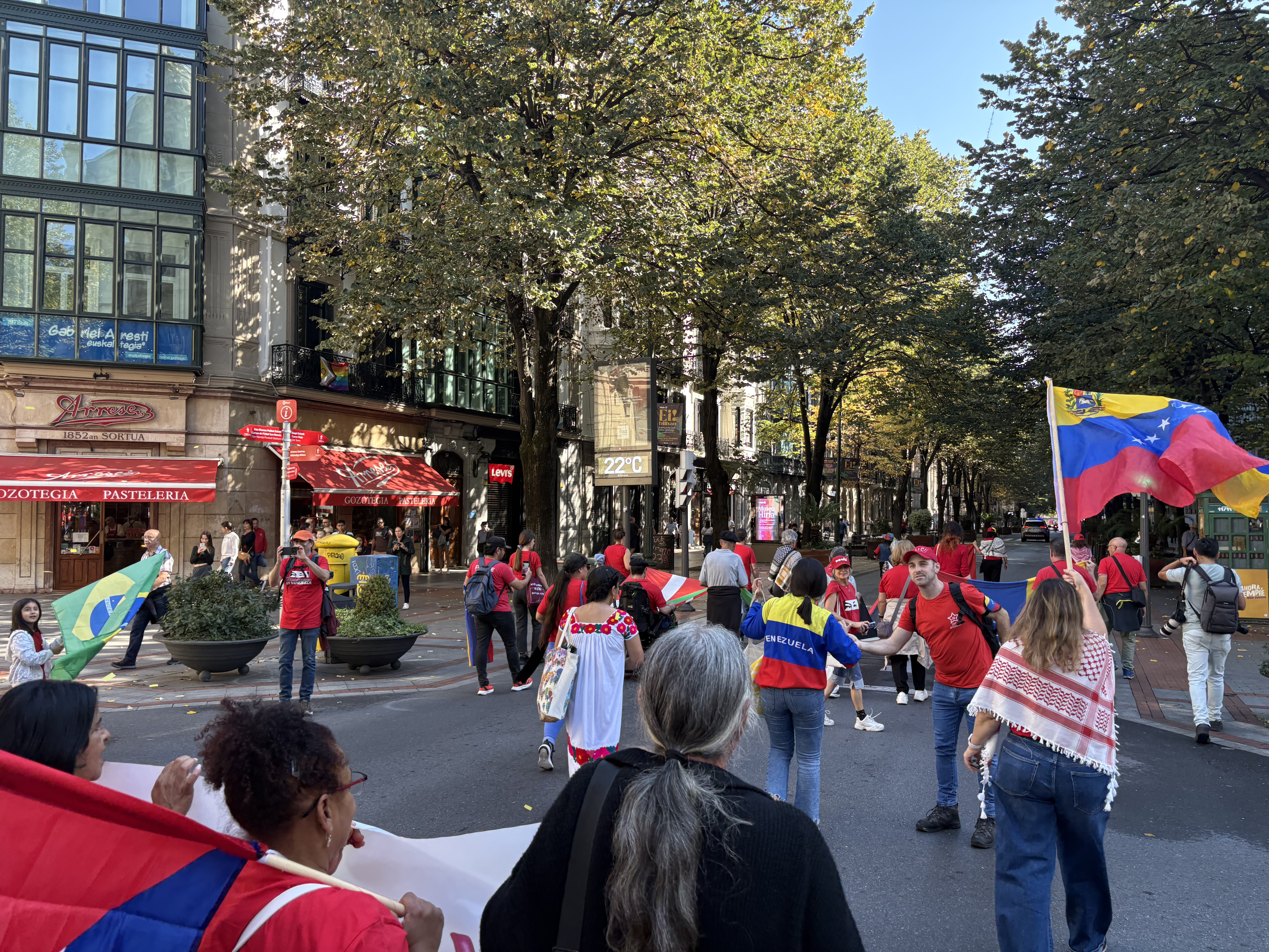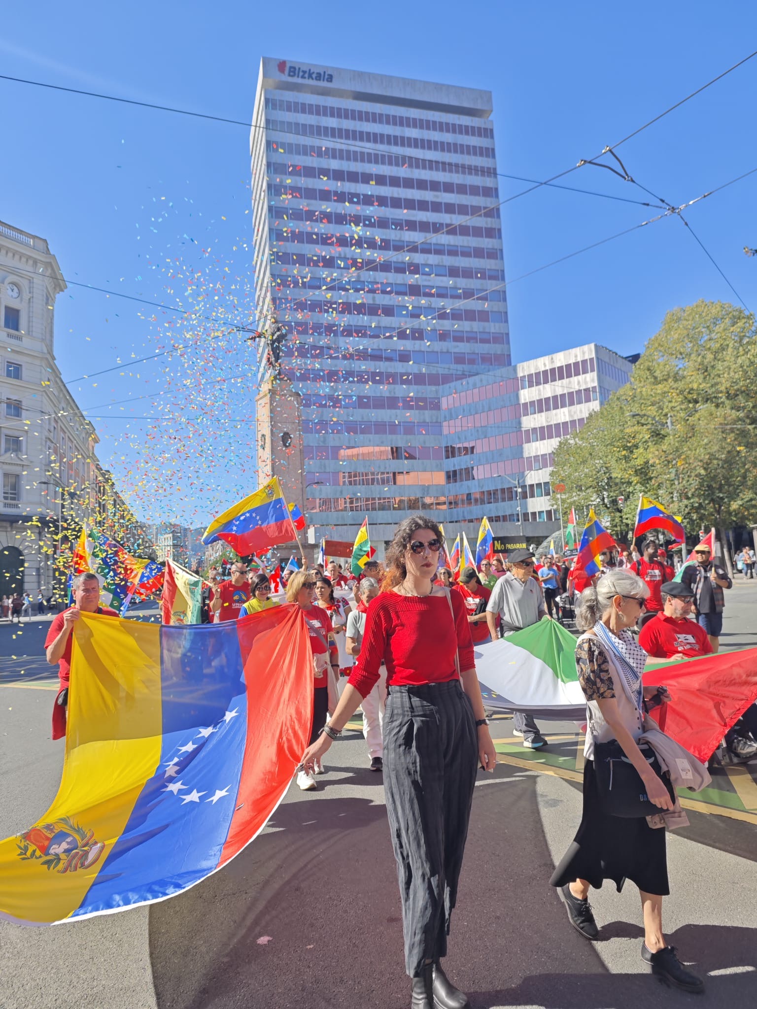 Las consignas "¡apoyo a la resistencias de los pueblos!", "¡No a la injerencia en Venezuela!" y "¡Stop al genocidio en Gaza!" acompañaron la marcha, coordinada por el Consulado General de Venezuela en Bilbao con organizaciones políticas y sindicales, colectivos y movimientos sociales de Euskal Herria.