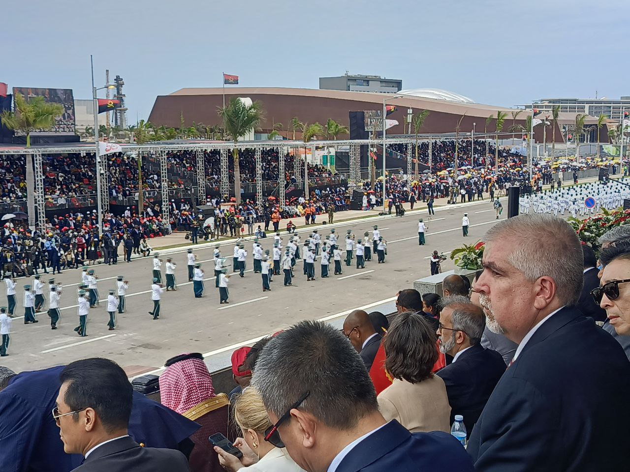 Desde la tribuna presidencial se apreció el colorido y alegre desfile cívico, en el cual marcharon representaciones de las 21 provincias del país; seguido del imponente desfile militar-policial, con el que las hijas e hijos de esta valerosa tierra de África Austral mostraron su orgullo y alegría por celebrar en paz, el año jubilar de Angola.
